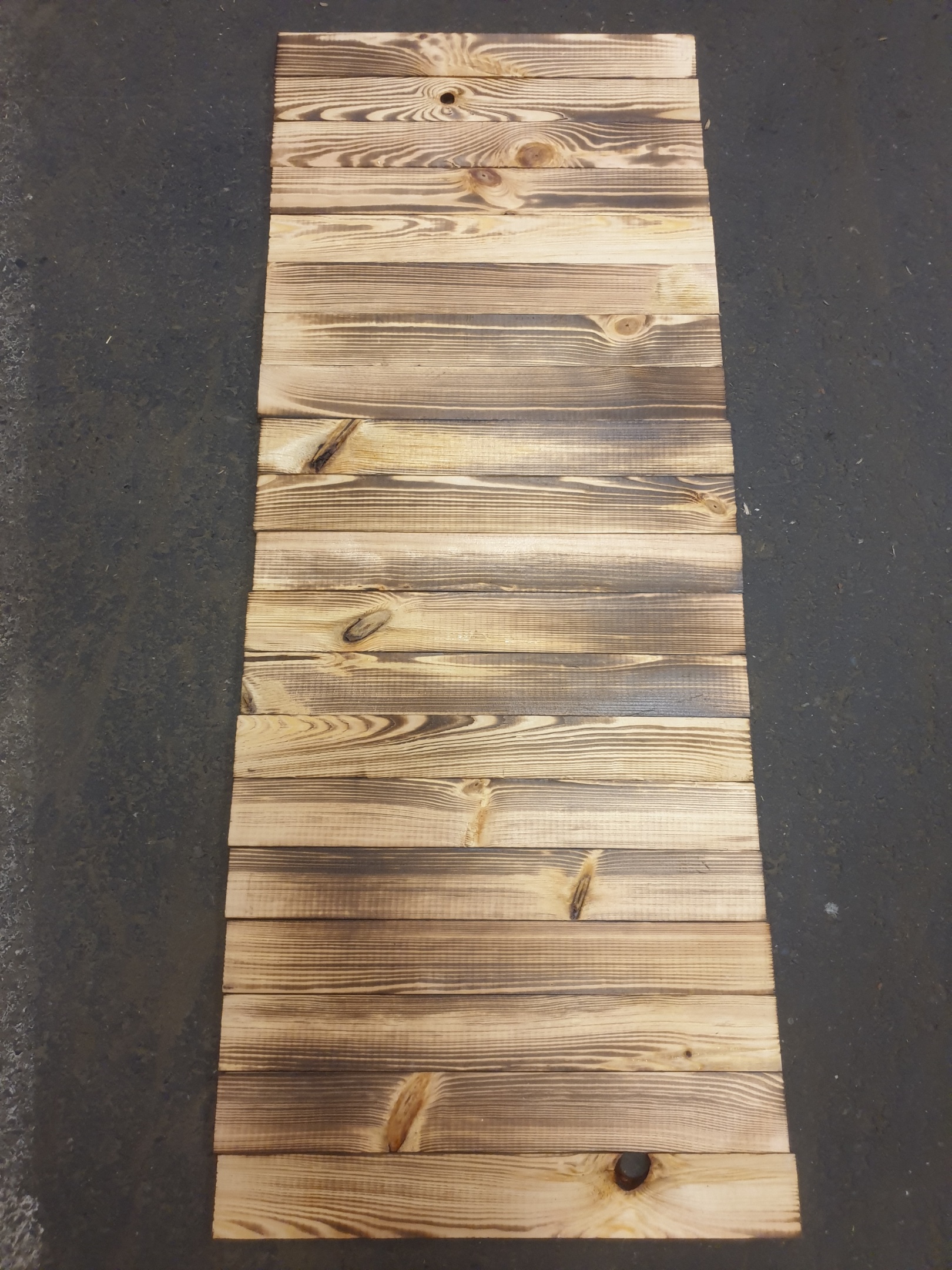 Achtung: Durch das abflammen der Bretter entsteht Russ, der abfärbt, diesen am Besten vorab mit einem feuchten Tuch entfernen oder einfach mit Klarlack behandeln.