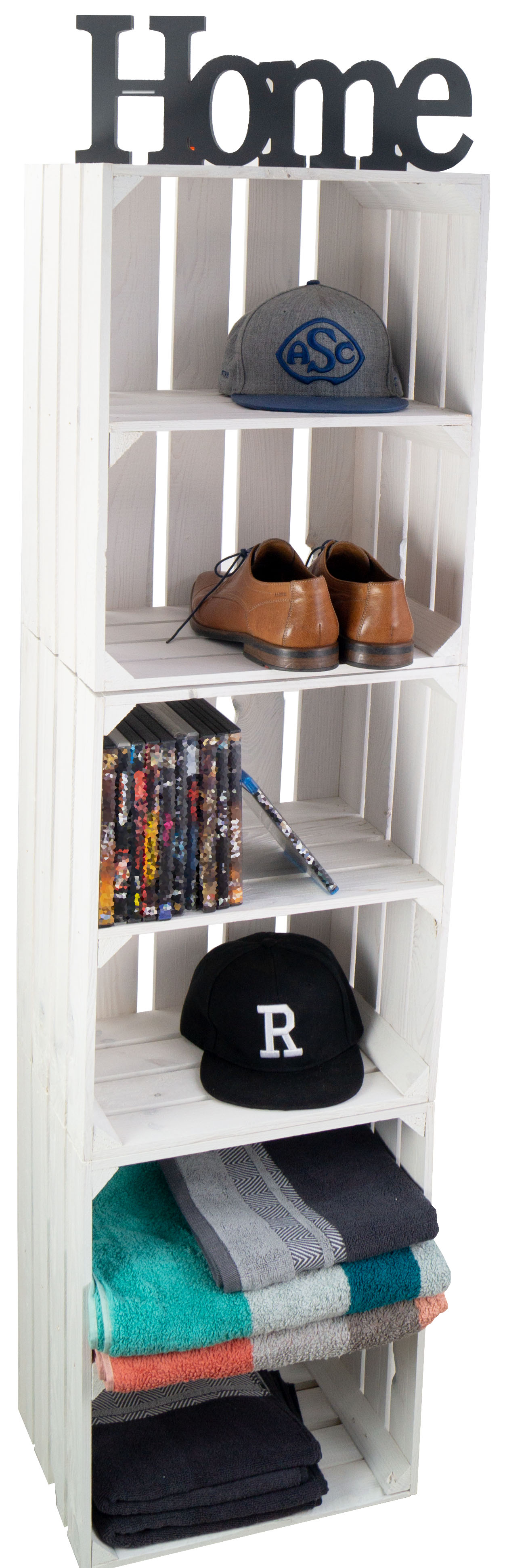 Hübsche Kisten, leichter Shabby Look, mit Klammern zusammen getackert, bei zwei Kisten lösten sich die Regalböden, mir 2,5 x20 Spaxx ließen sich die Regalböden wieder befestigen.
