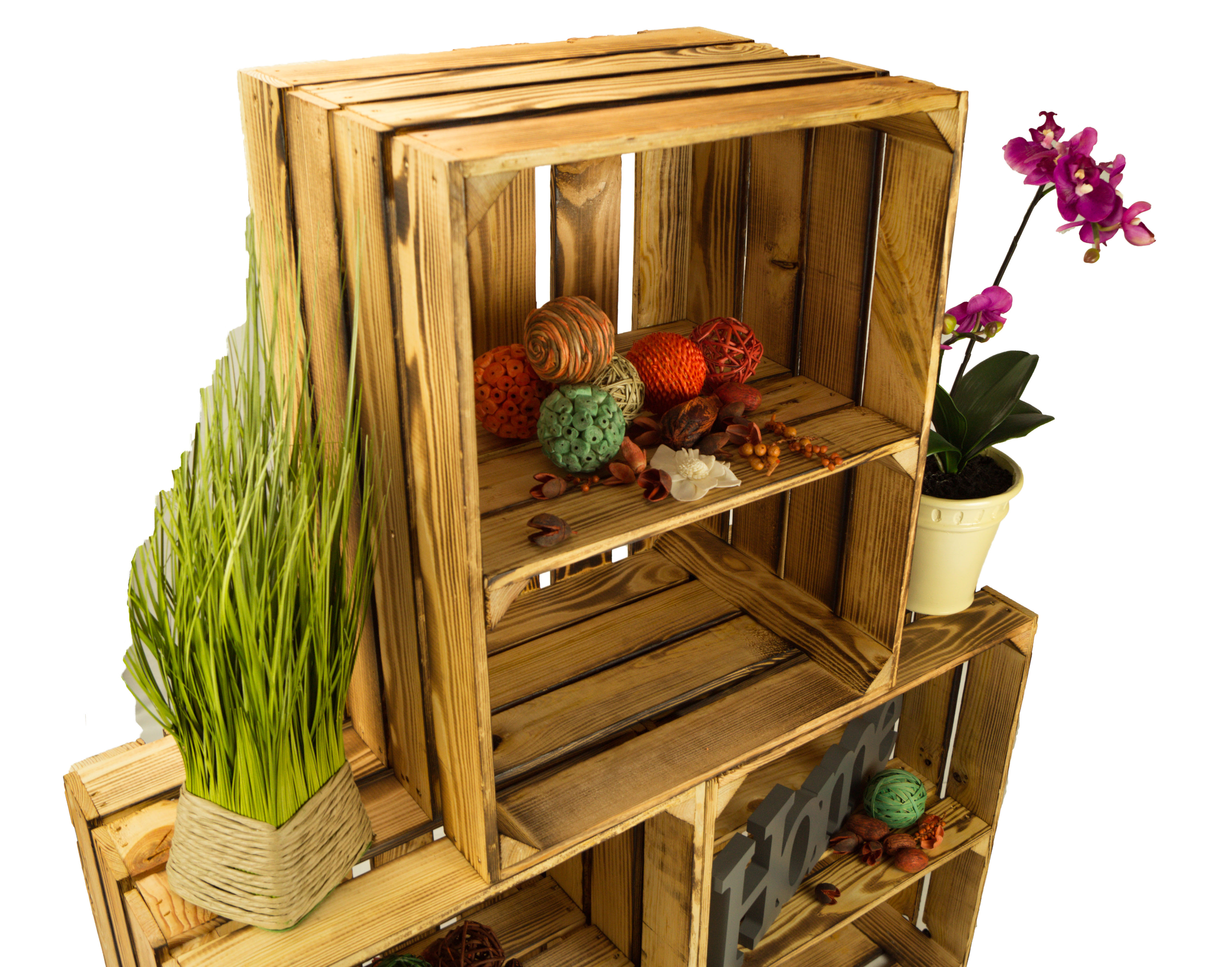 Dieses schöne Ensemble besteht aus 3 Holzkisten. Sie wurden, wie alle unsere neuen Kisten, aus FSC zertifiziertem Holz hergestellt und anschließend mit einem speziellen Gasbrenner veredelt. Dadurch kann es vorkommen, dass die Kisten noch einmal mit einem nassen Lappen nachbehandelt werden muss, um eventuelle Russrückstände zu entfernen.