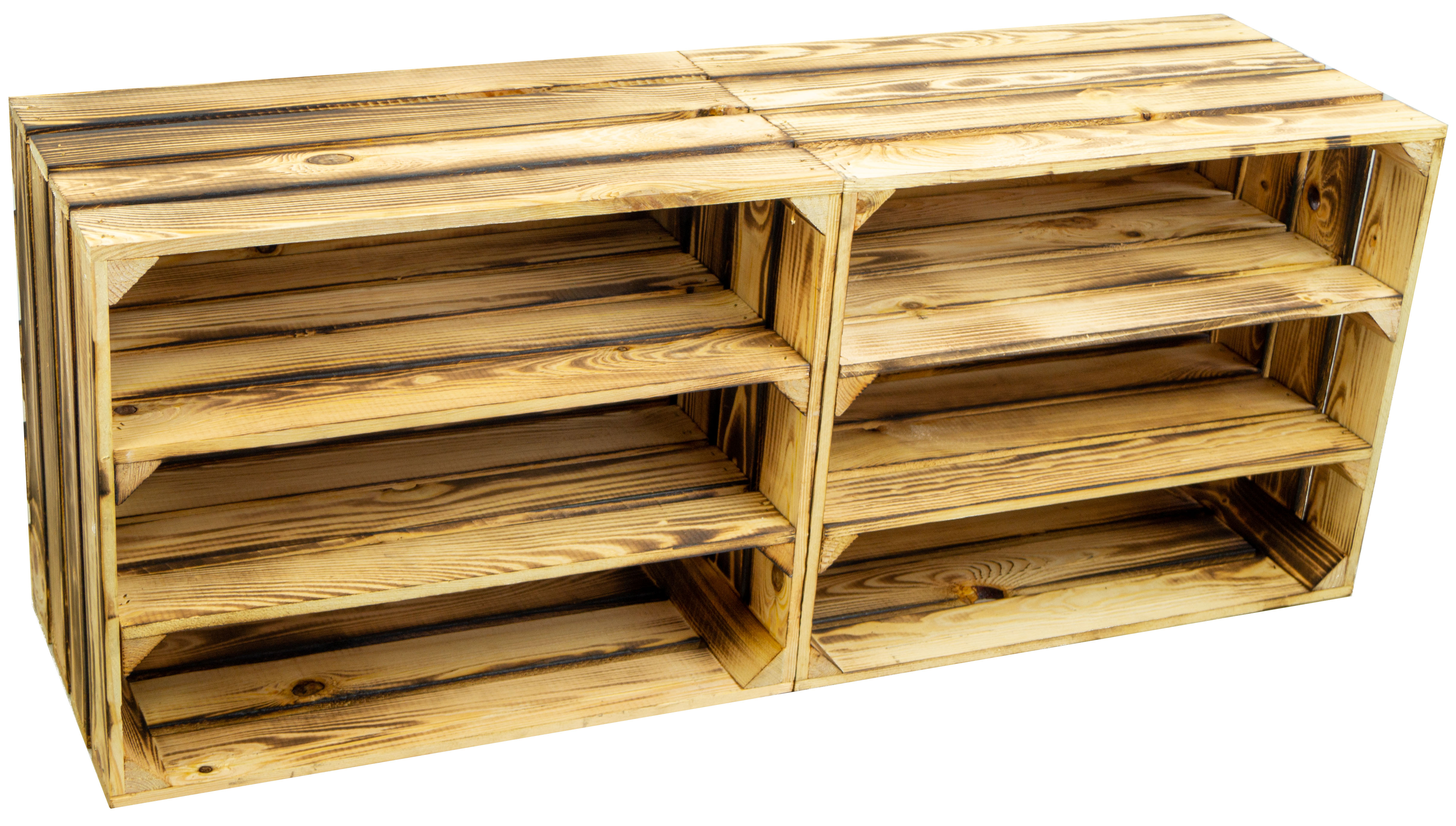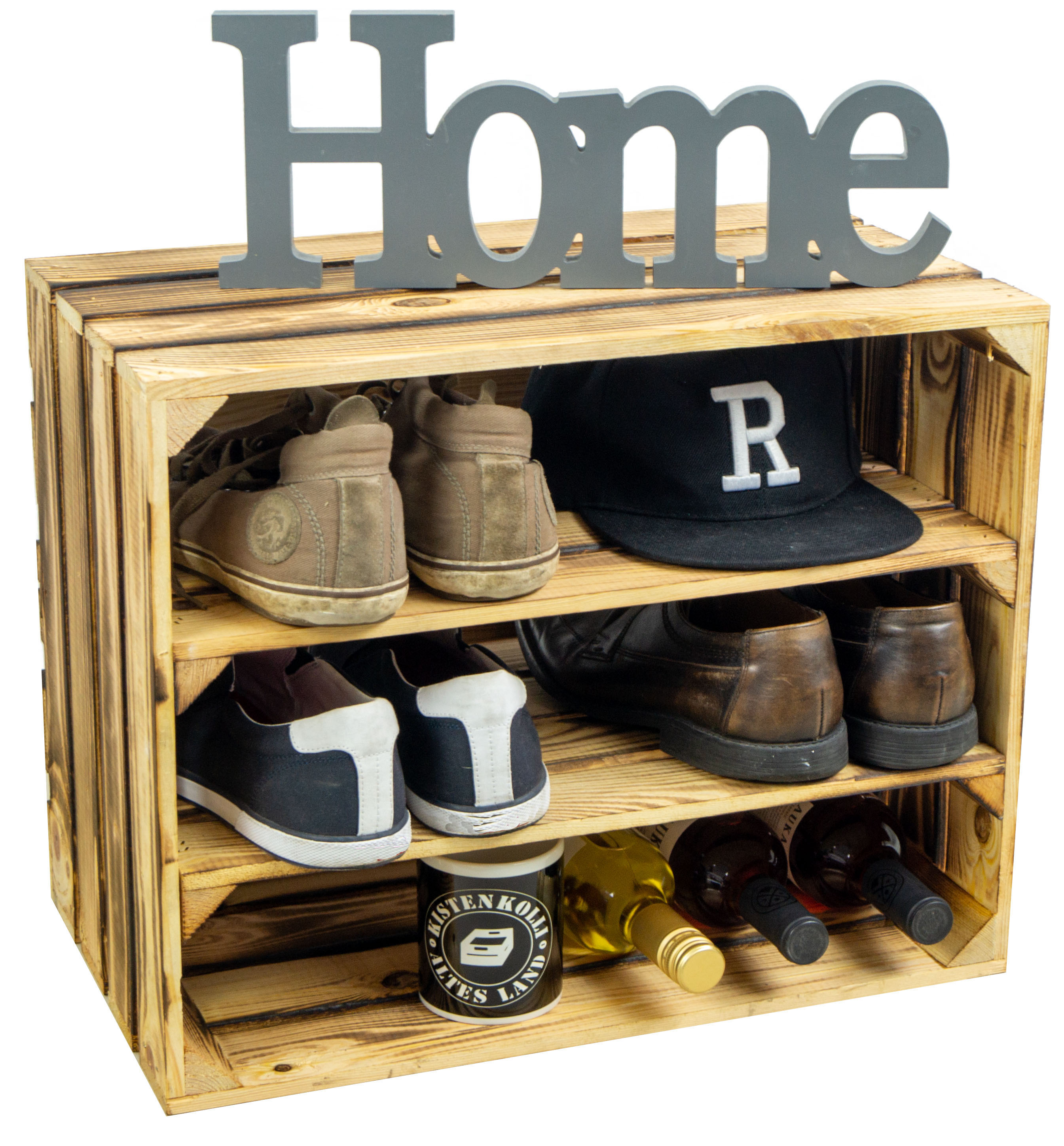 Tolle Regalkisten für Ihr zu Hause, diese neue Design hat nun bereits zwei montierte Mittelbretter in der Kiste, somit noch mehr Stauraum pro Kiste für Ihre Schuhe. Durch die etwas geringere Höhe pro Fach (ca. 12cm) passen Vorzugsweise nur flache Sneaker oder Halbschuhe in die Fächer. Passende Kisten mit einer Quereinlage oder nur einem Mittelbrett für höhere Schuhe finden Sie auch bei uns, so können Sie diese Kisten wunderbar mit unseren anderen Ausführungen kombinieren. Auch als Weinregal oder Weinschrank wunderbar zu benutzen, die Kisten sind stabil genug um diese komplett mit Weinflaschen zu füllen. Wenn man alle drei Kisten übereinander stellt sollte man diese jedoch an der Wand (mit schrauben) sichern um ein mögliches umkippen zu vermeiden. Achtung geflammte Kiste: Vor dem Gebrauch in der Wohnung sollte man den entstandenen Russ durch das flambieren mit einem feuchten Lappen entfernen und ggf. noch mit einem Klarlack lackieren/ versiegeln.