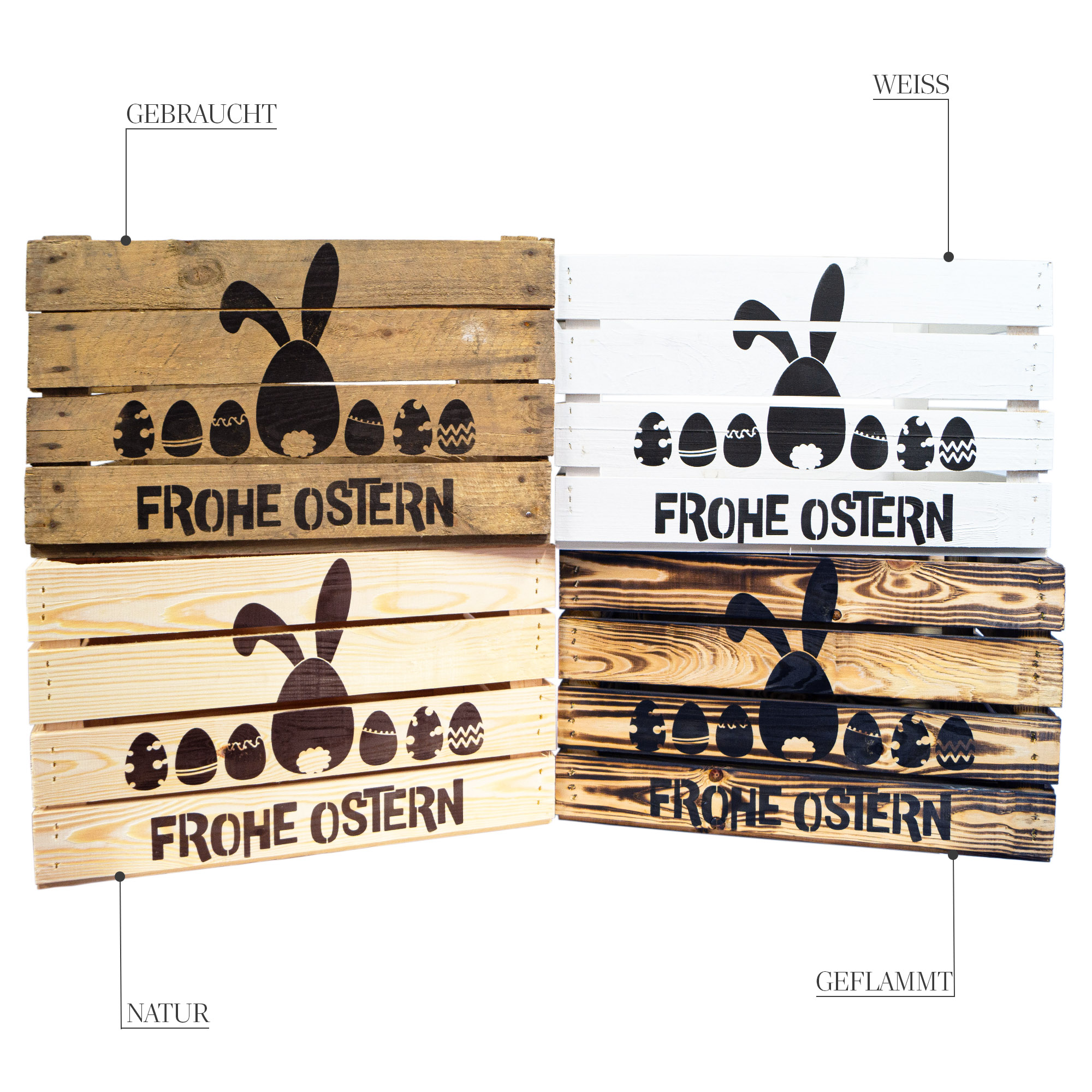 Holzkiste Johanna mit Ostermotiv Frohe Ostern (Hase und Eier) 50 x 40 x 30 cm – Osterdeko