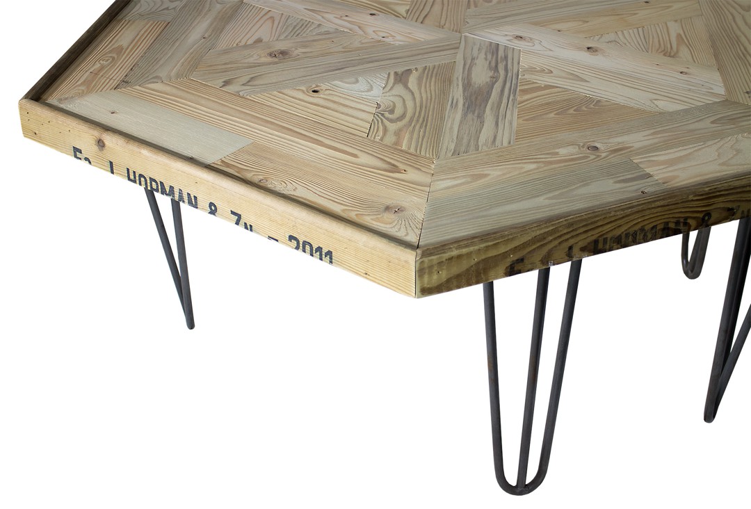 Exklusiver Sechseck-Couchtisch aus alten Apfelsteigen auf Hairpin-Legs 99x99x39cm