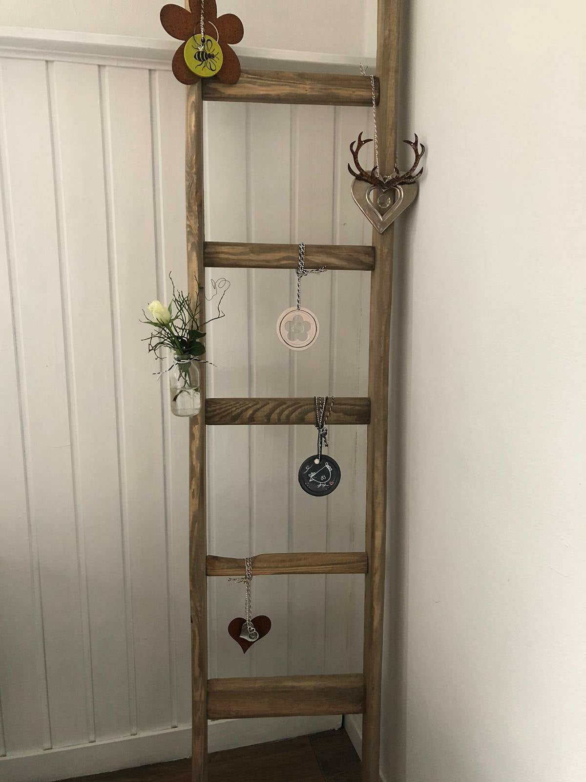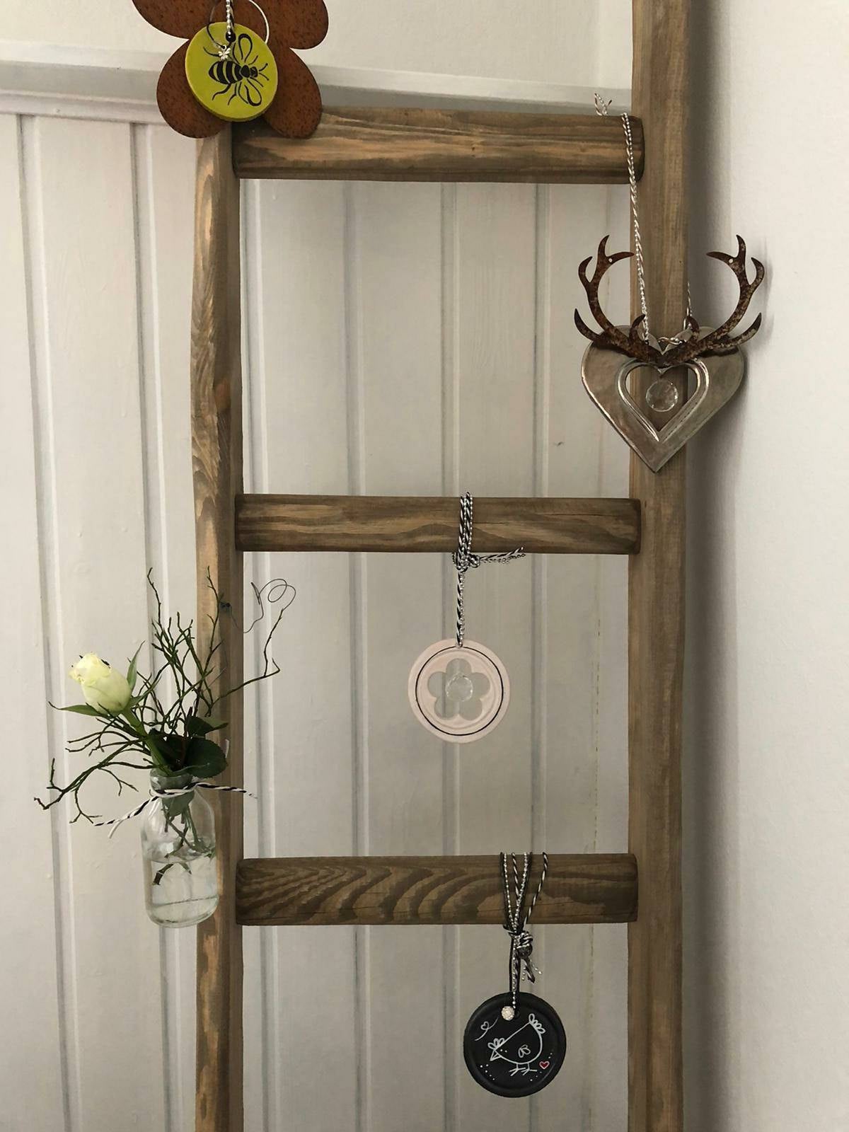 Die Holzleiter Altländer Art ist flexibel einsetzbar und es findet sich so gut wie in jedem Wohnraum ein Plätzchen, ob an der Wand oder on der Decke hängend, an die Wand gelehnt als individueller Handtuchhalter oder im Außenbereich zur Dekoration.
