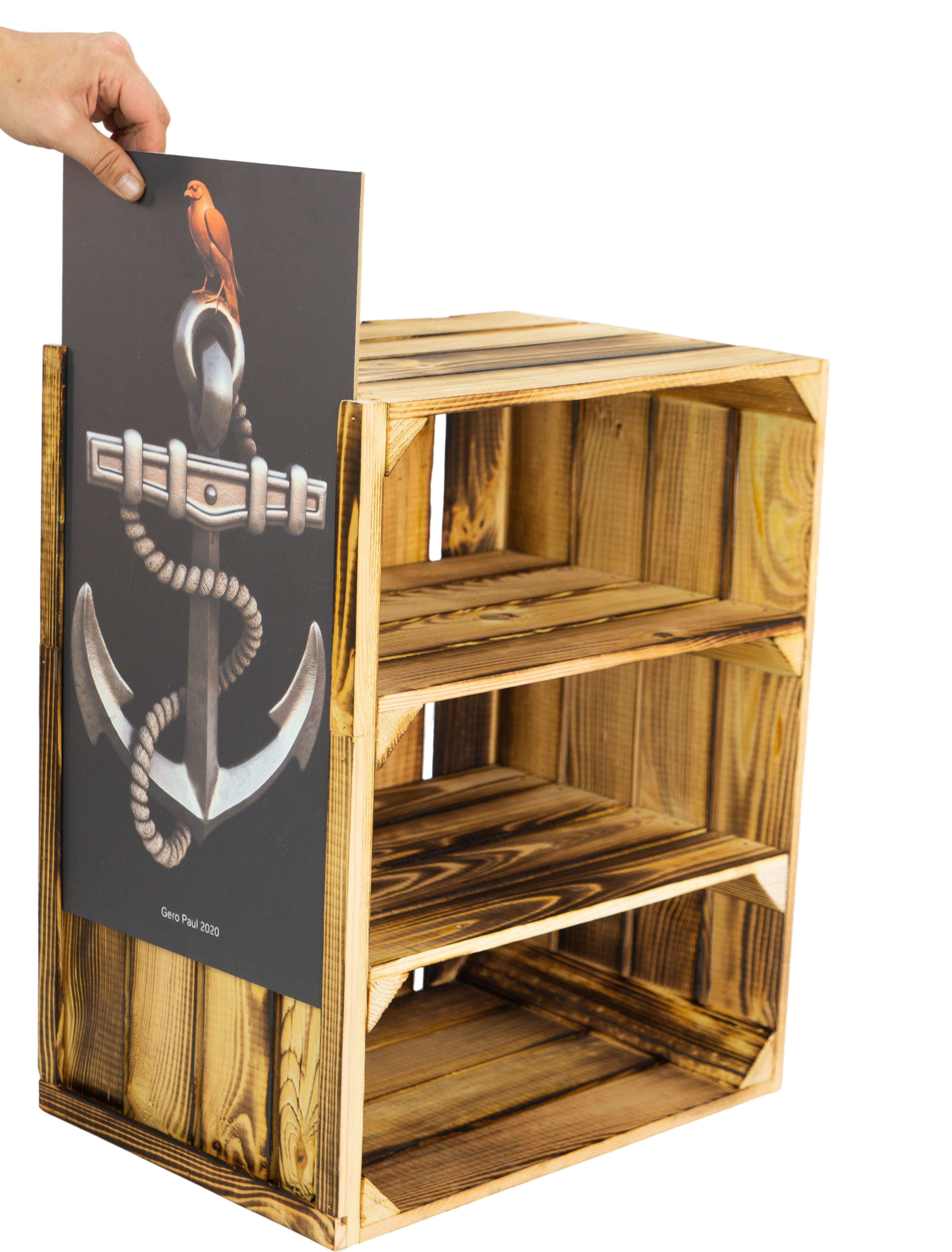 Mit einzigartigen limitierten Bildern von unserem lokalem Künstler Gero Paul, haben wir nun eine tolle Veredelung unsere Kisten geschaffen, mit unseren extra angefertigten Holzrahmen lassen sich die Bilder ganz einfach als Stecksystem an unserer Kiste montieren. Ein Austausch der Bilder ist somit absolut kein Problem, sollte ein Motiv also mal langweilig werden, können Sie bequem auch auf weitere tolle Motive aus unsere Auflage nachbestellen.