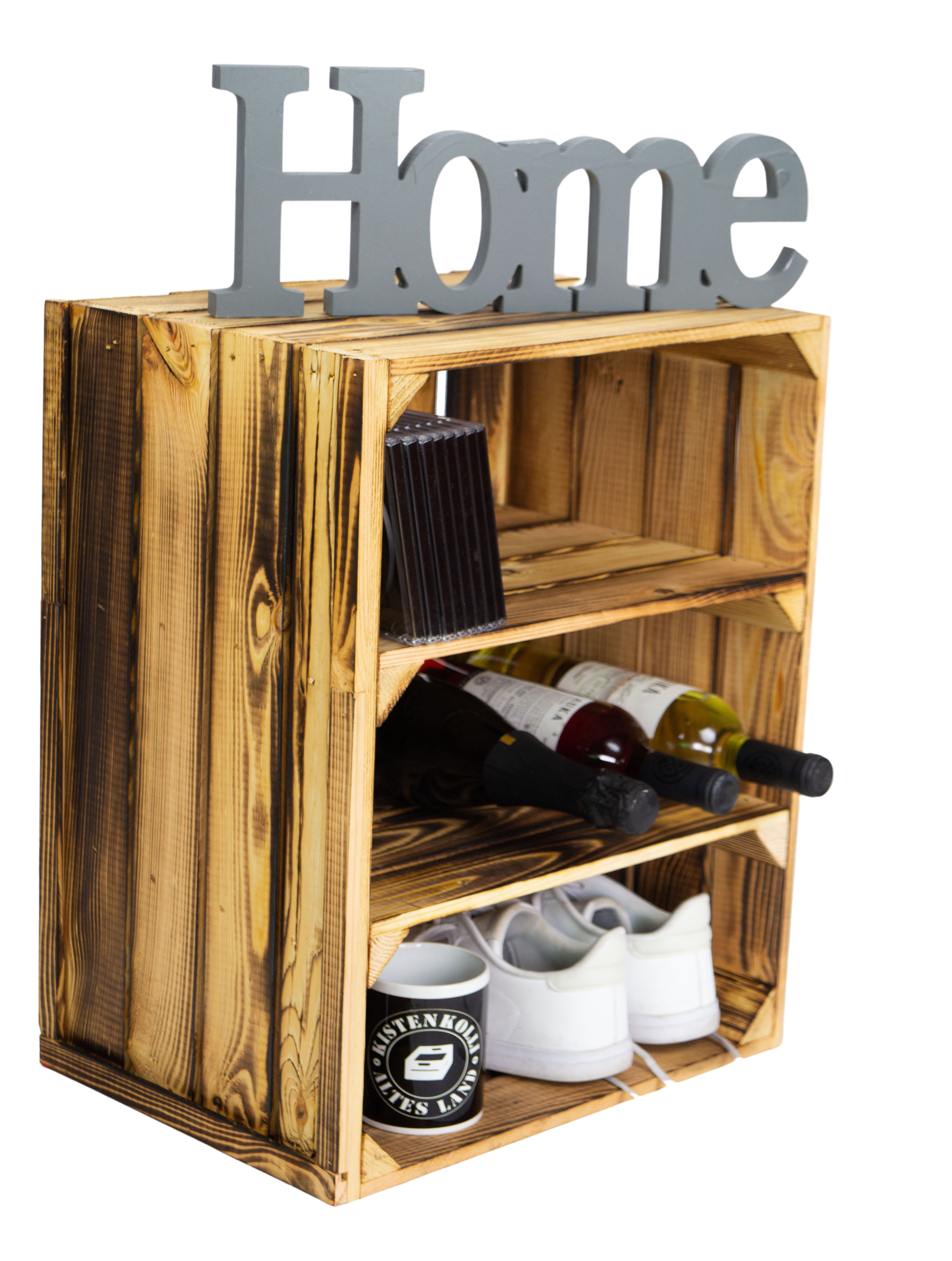 Das Obstkistenregal wurde mit zwei horizontalen Zwischenböden versehen, dadurch entsteht ein tolles Regal mit viel Stauraum. Es lässt sich wunderbar im Wohnzimmer aufstellen. Es kann auch als Schuhregal oder als Vitrine für diverse Sachen genutzt werden.