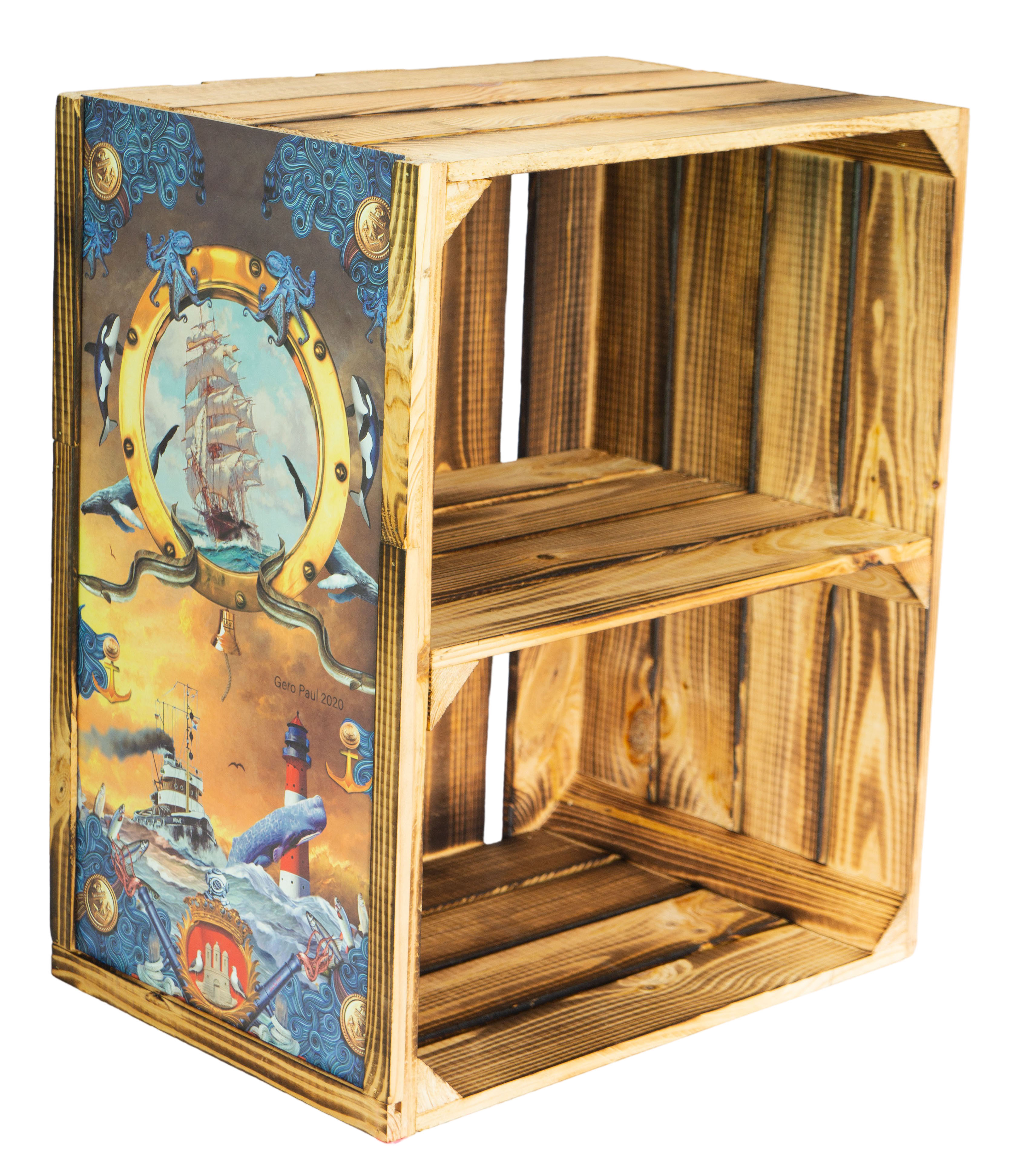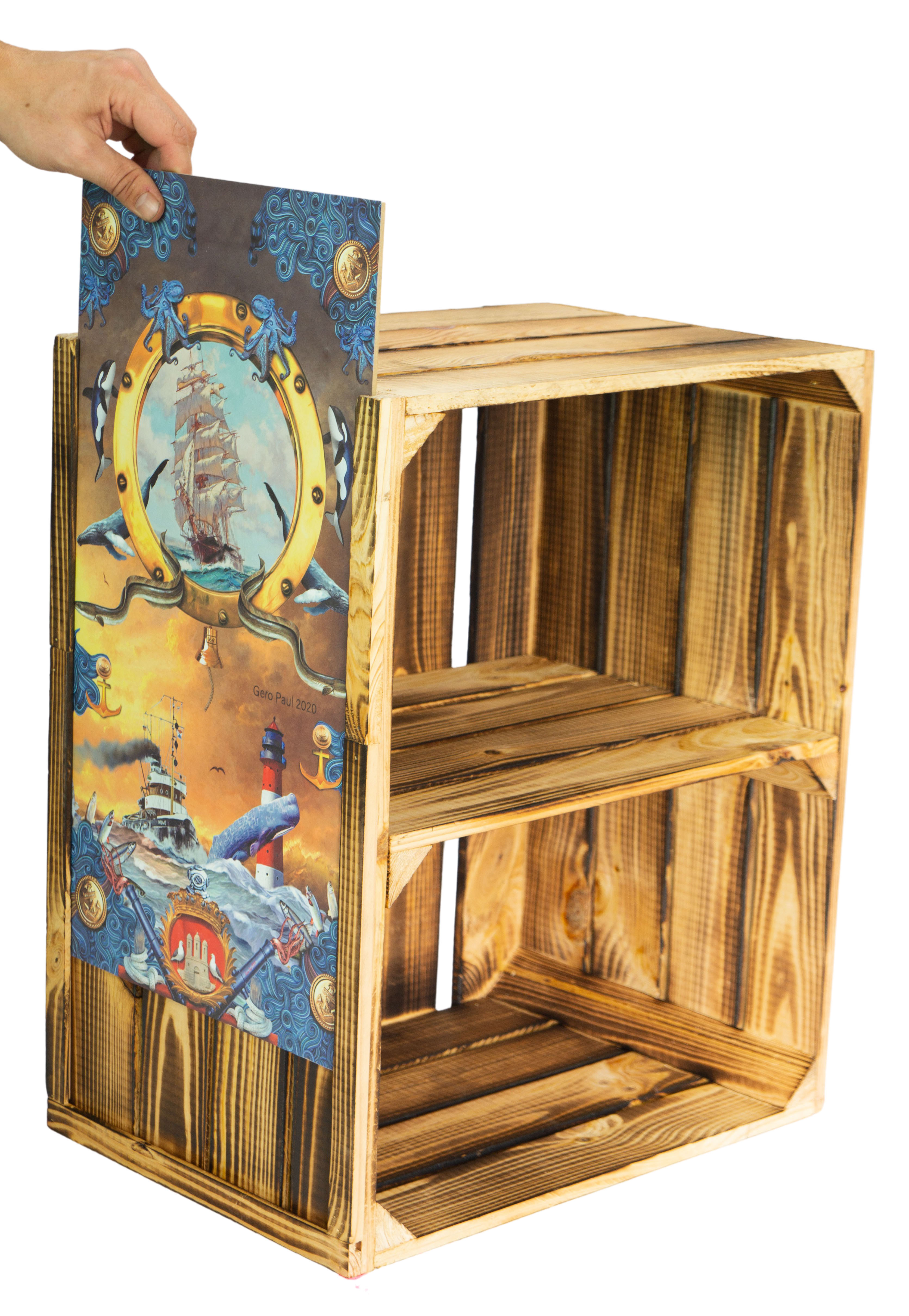 Mit einzigartigen limitierten Bildern von unserem lokalem Künstler Gero Paul, haben wir nun eine tolle Veredelung unsere Kisten geschaffen, mit unseren extra angefertigten Holzrahmen lassen sich die Bilder ganz einfach als Stecksystem an unserer Kiste montieren. Ein Austausch der Bilder ist somit absolut kein Problem, sollte ein Motiv also mal langweilig werden, können Sie bequem auch auf weitere tolle Motive aus unsere Auflage nachbestellen.