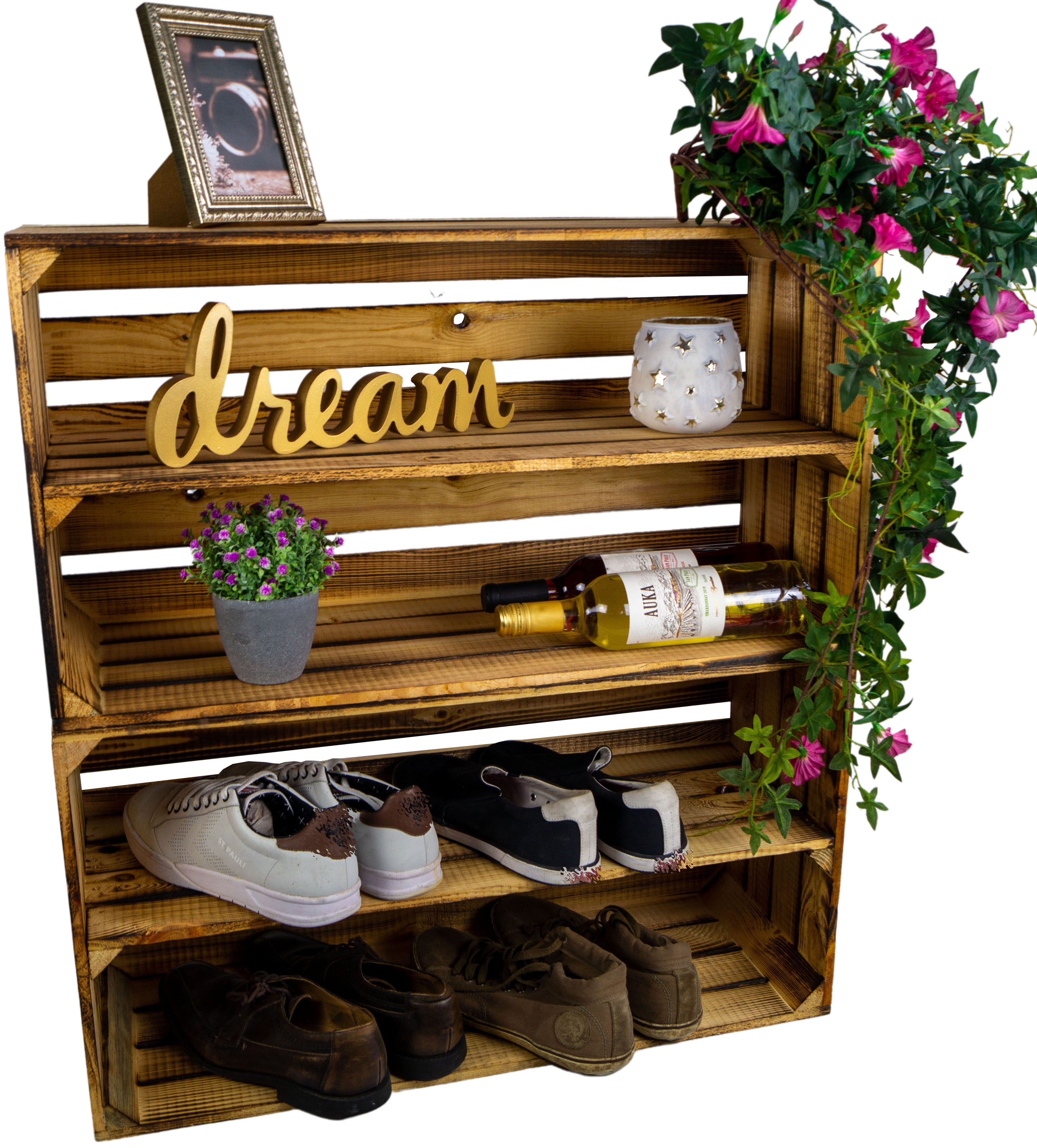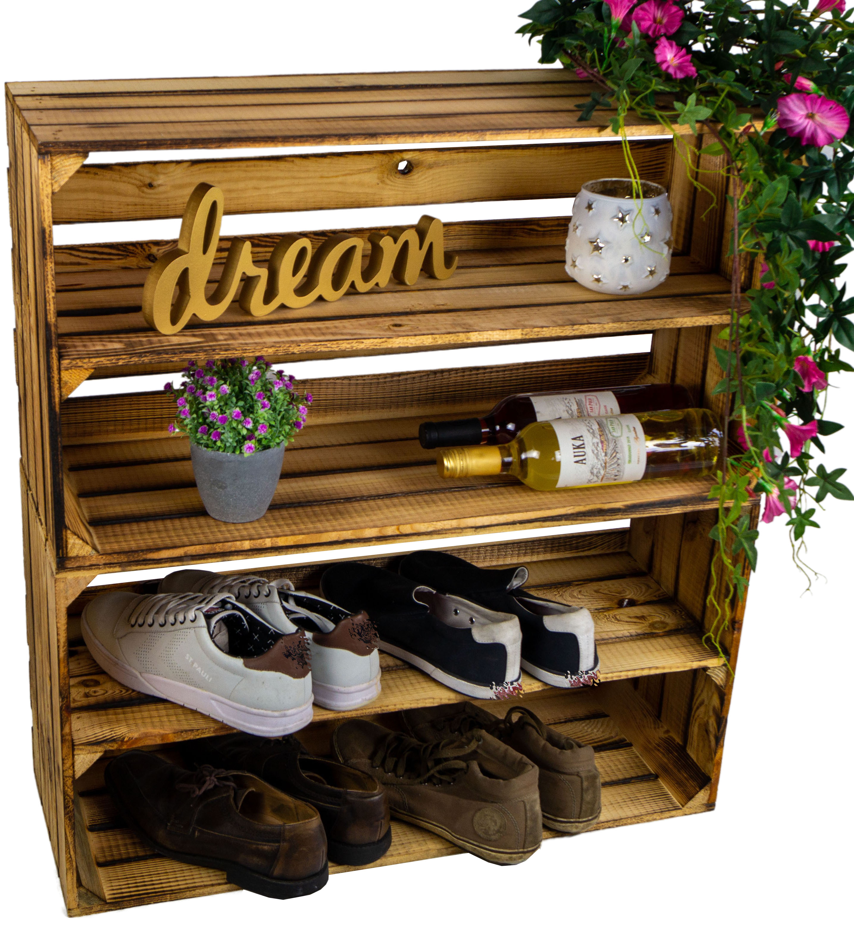 Mit unseren Kisten kannst du dir tolel D.I.Y. Regale bauen, die genau deinen Bedürfnissen entsprechen, denn nur Du weißt wieviel Schuhe due hast, und wenn du "ausversehen" schon wieder neue Schuhe gekauft hast, kannst du das Regal einfach erweitern.