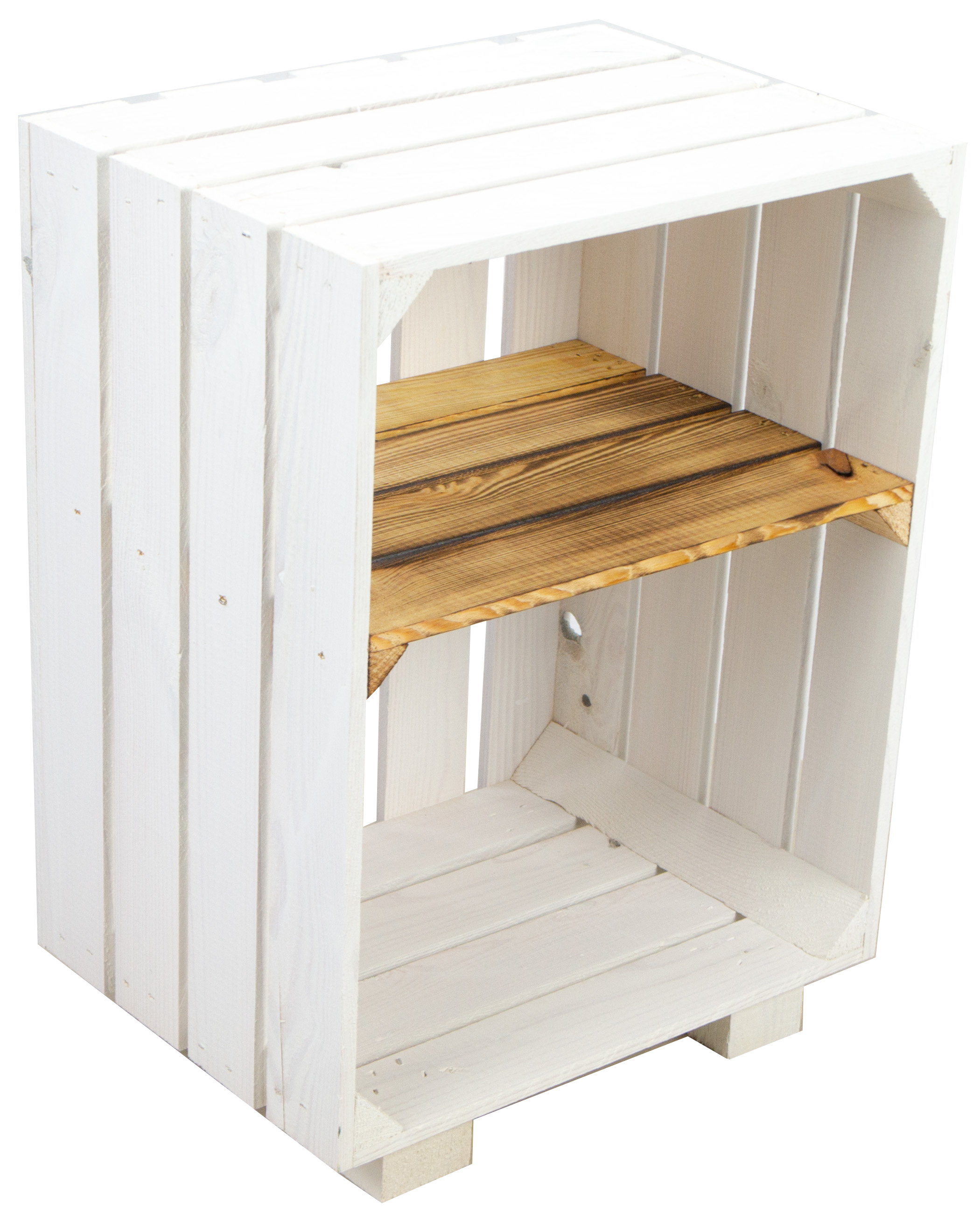 Toller kleiner Nachttisch oder Ablagetisch der mit einem Regalbrett versehen wurde, dieses wurde extra etwas Höher eingesetzt damit man in dem unteren Teil der Kiste etwas mehr Stauraum hat.