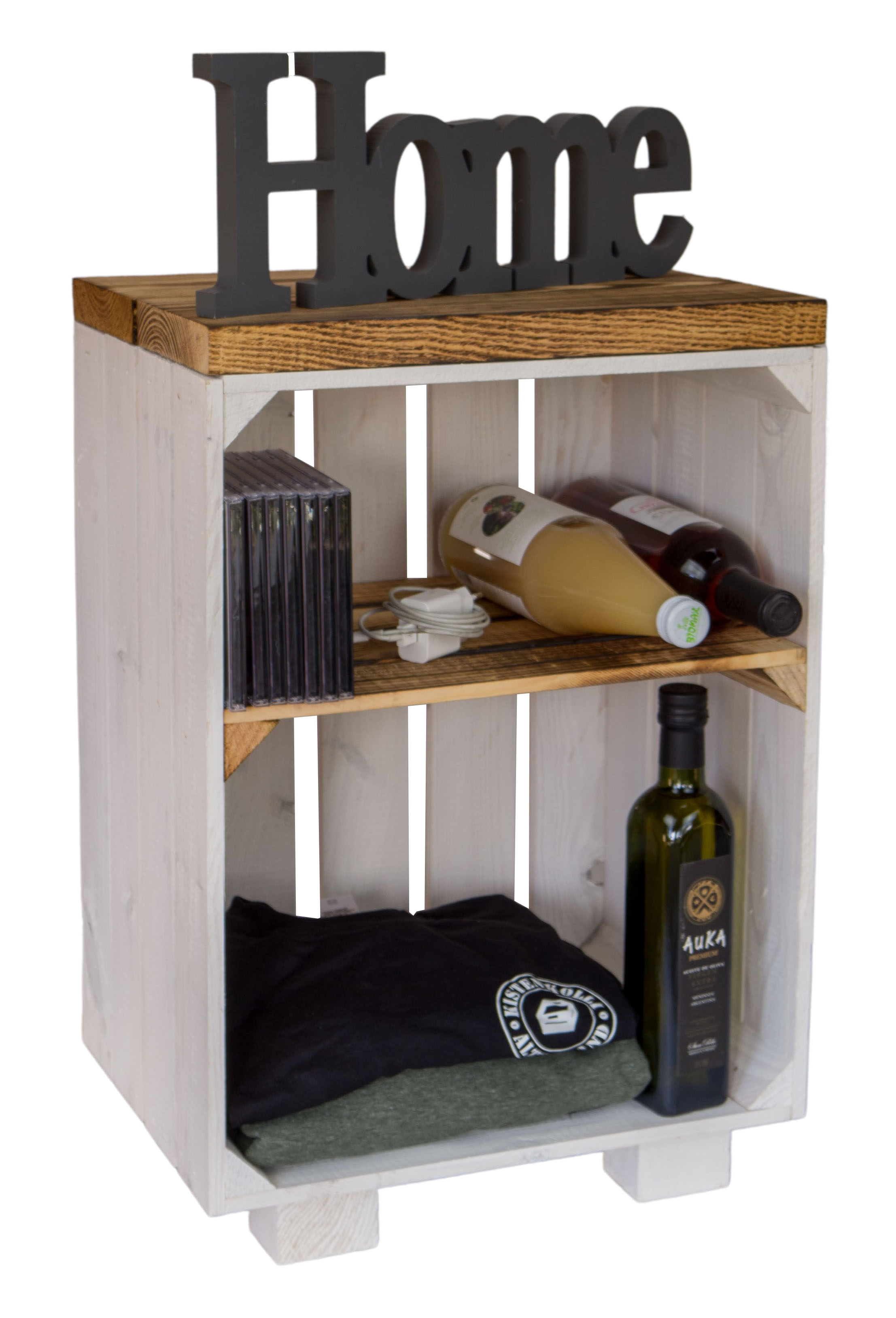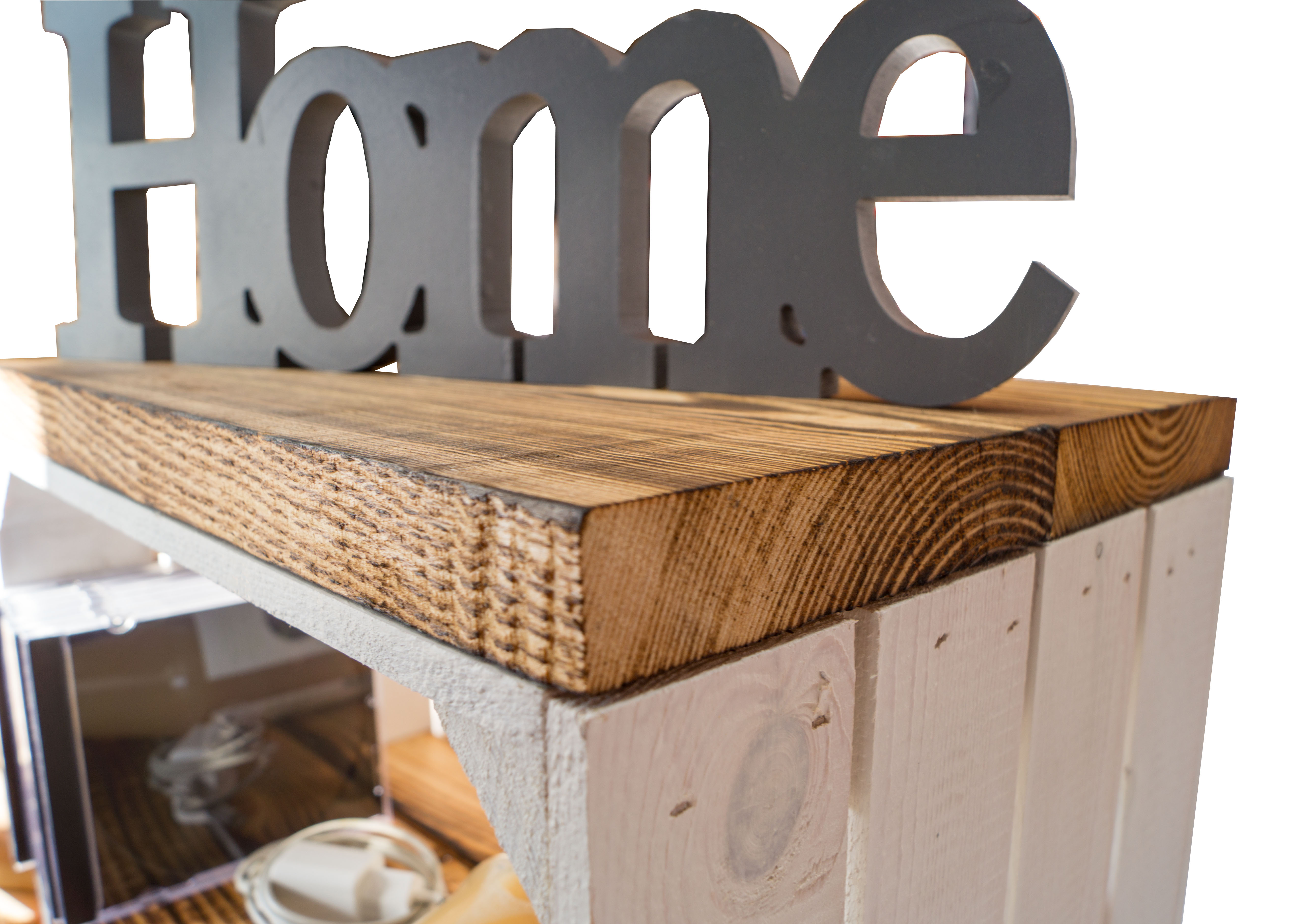 Nachttisch weiss mit geflammten Holzplanken mit Mittelbrett geflammt