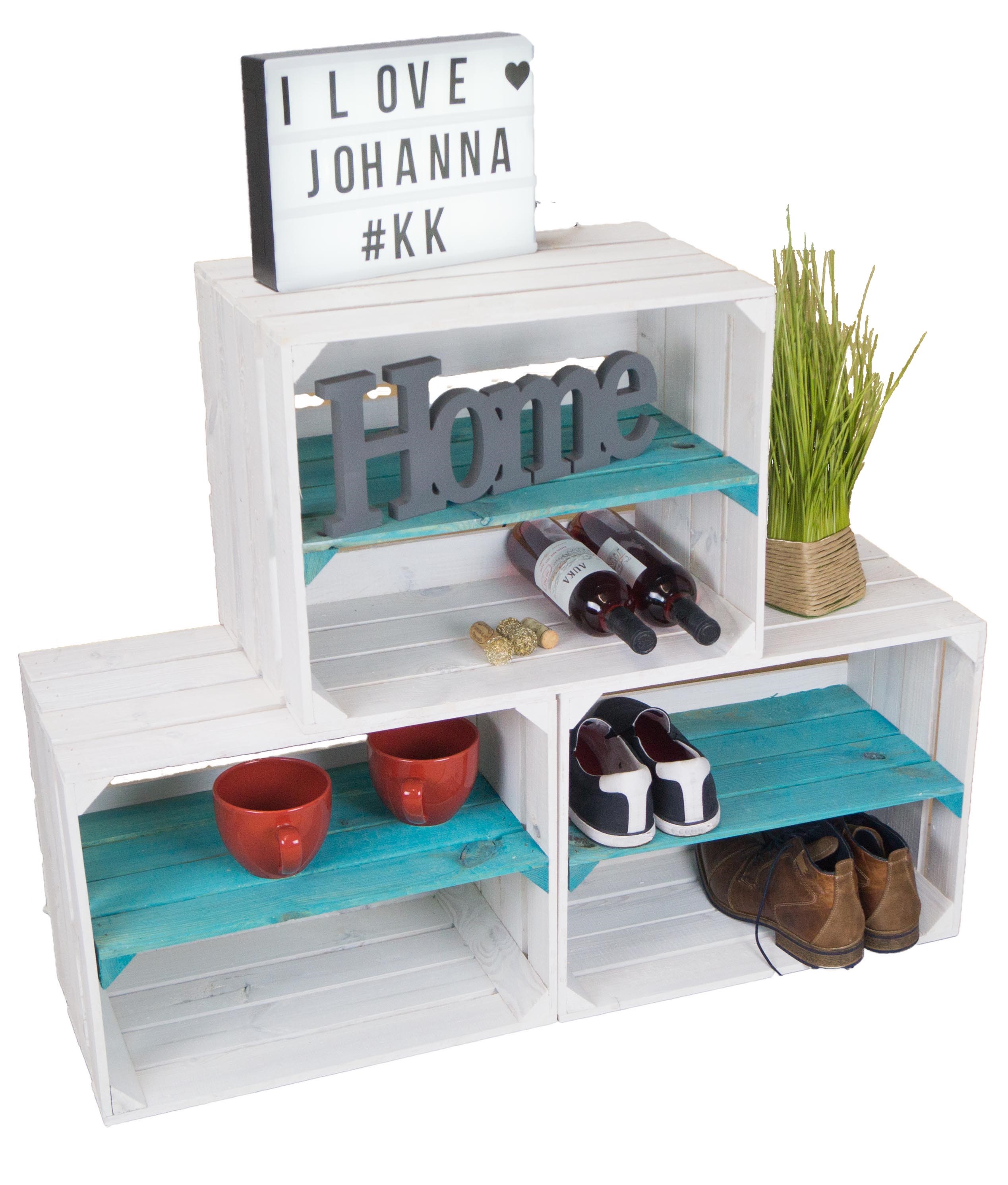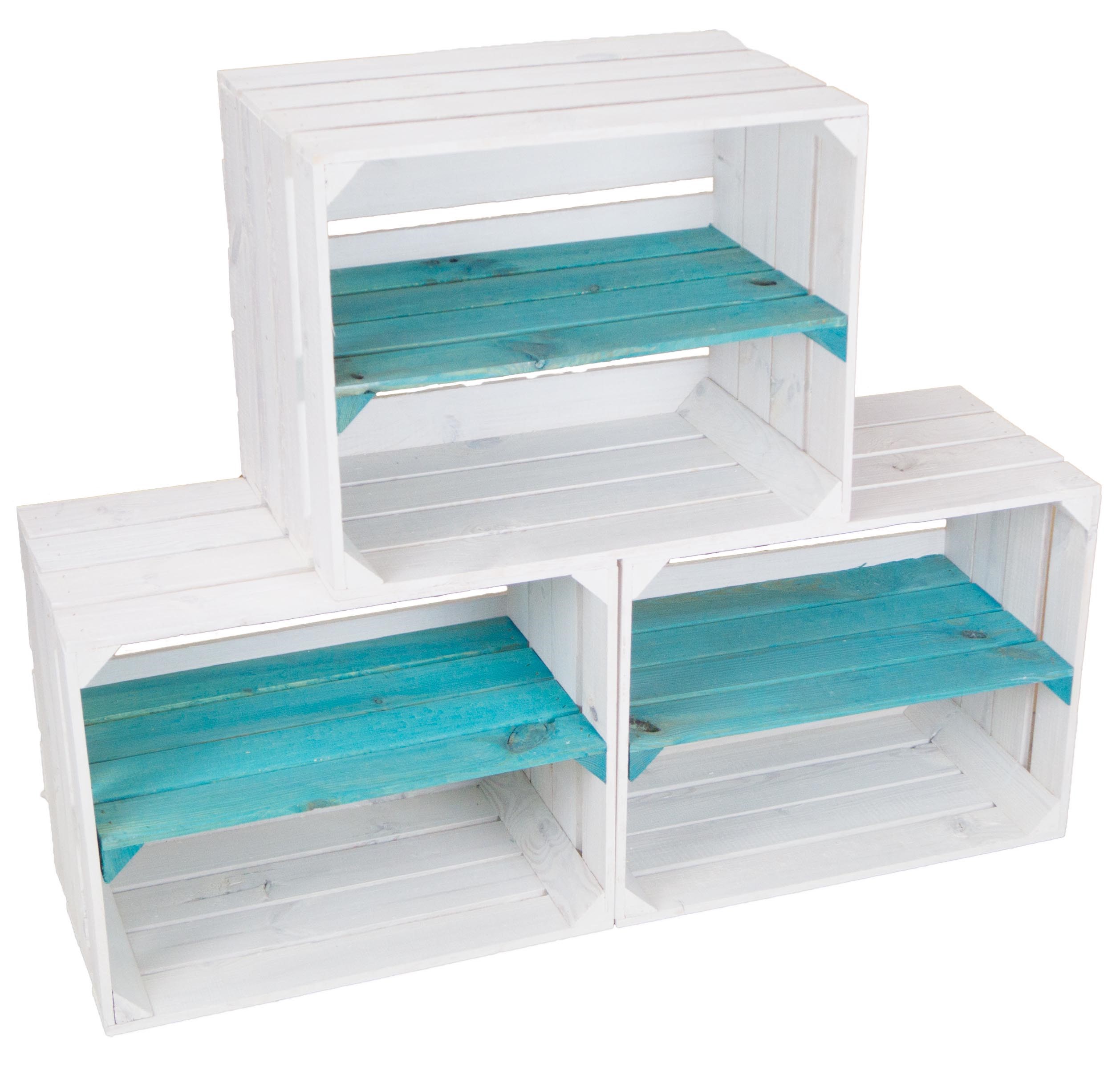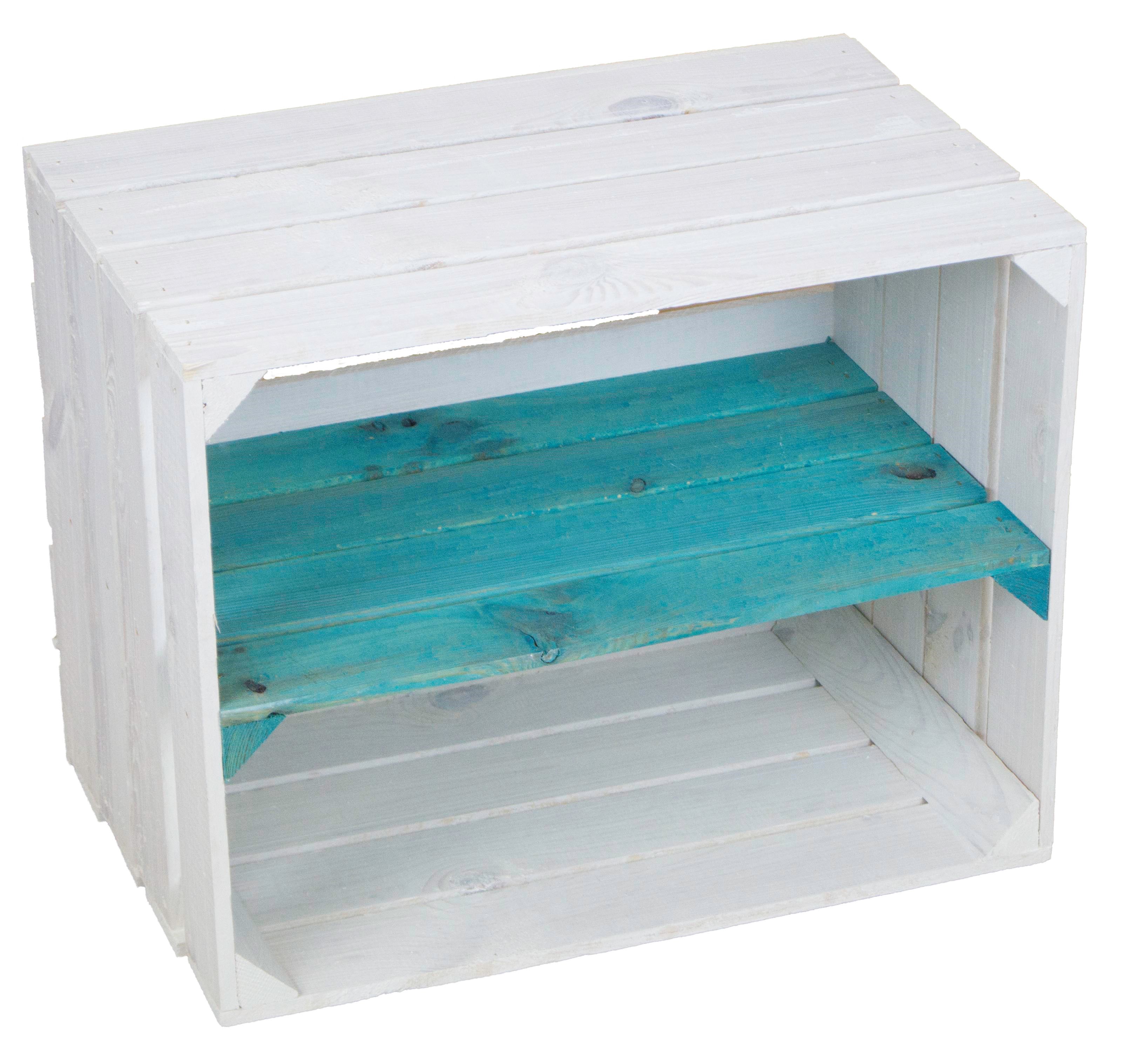 Regalkiste Johanna weiß lasiert mit türkisem Längsbrett