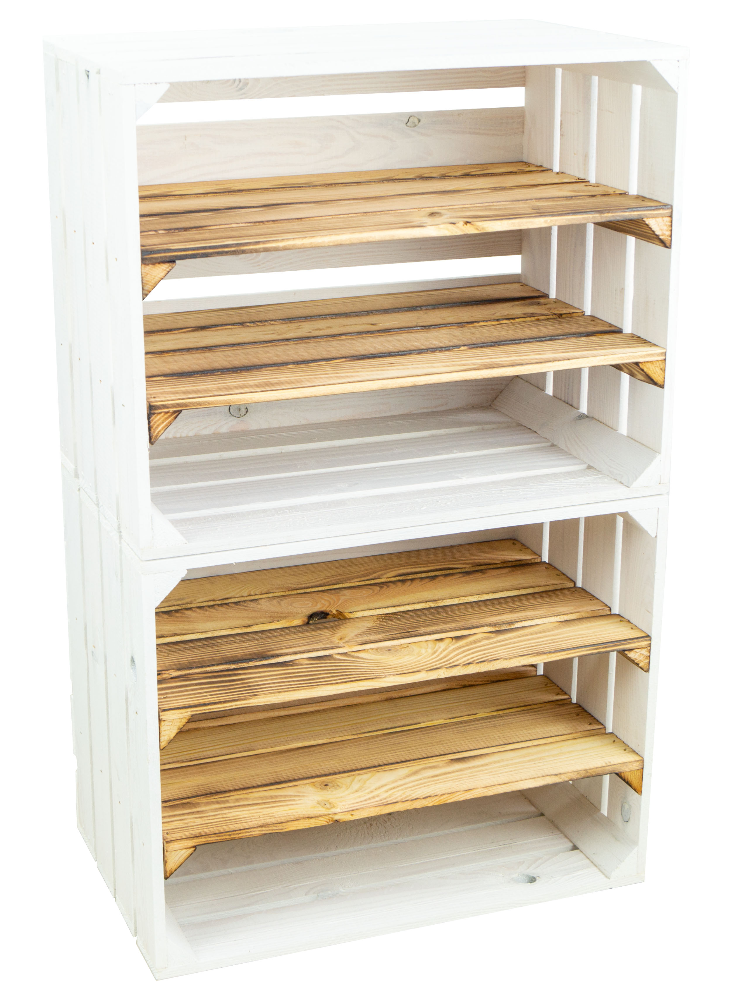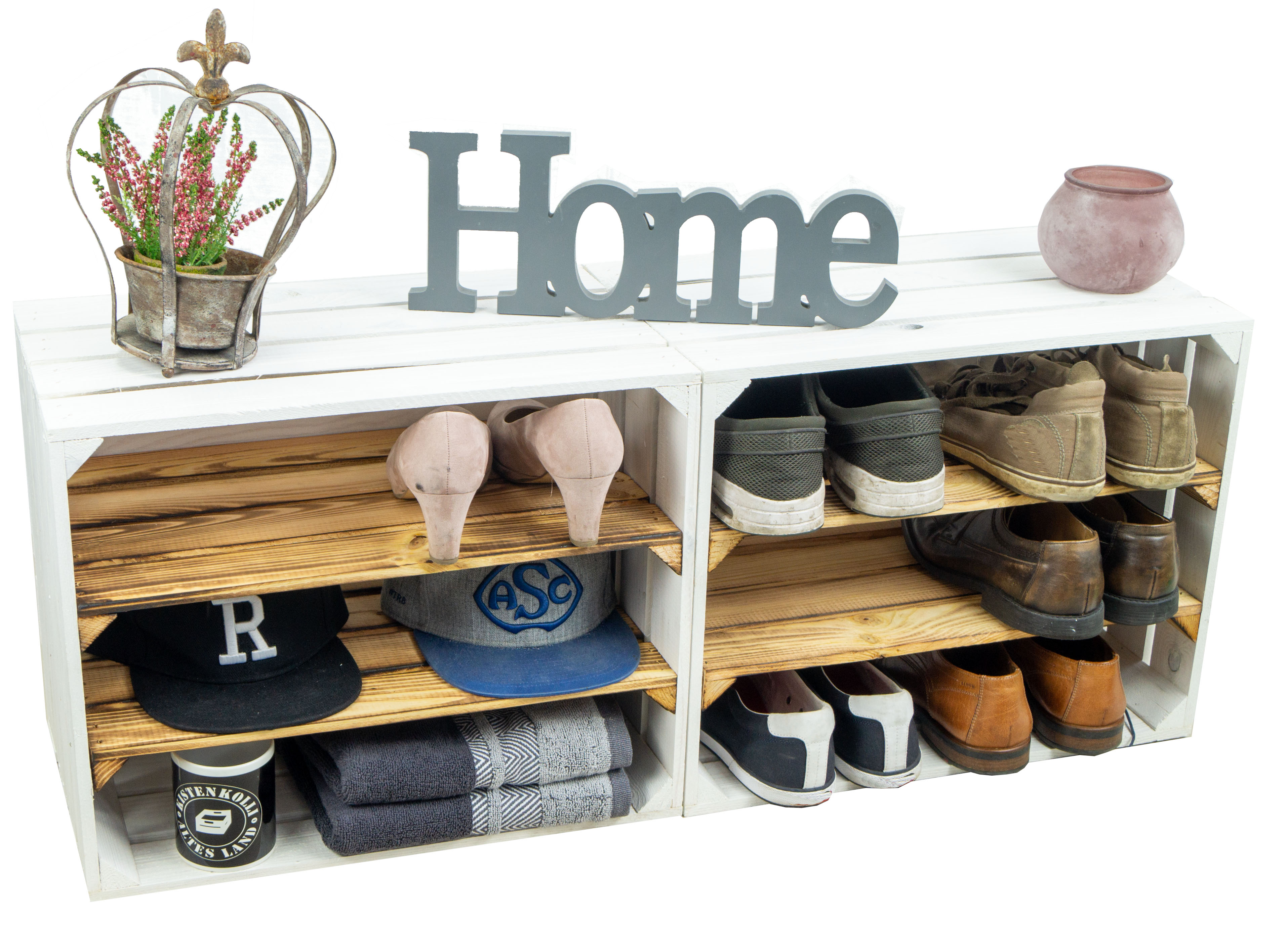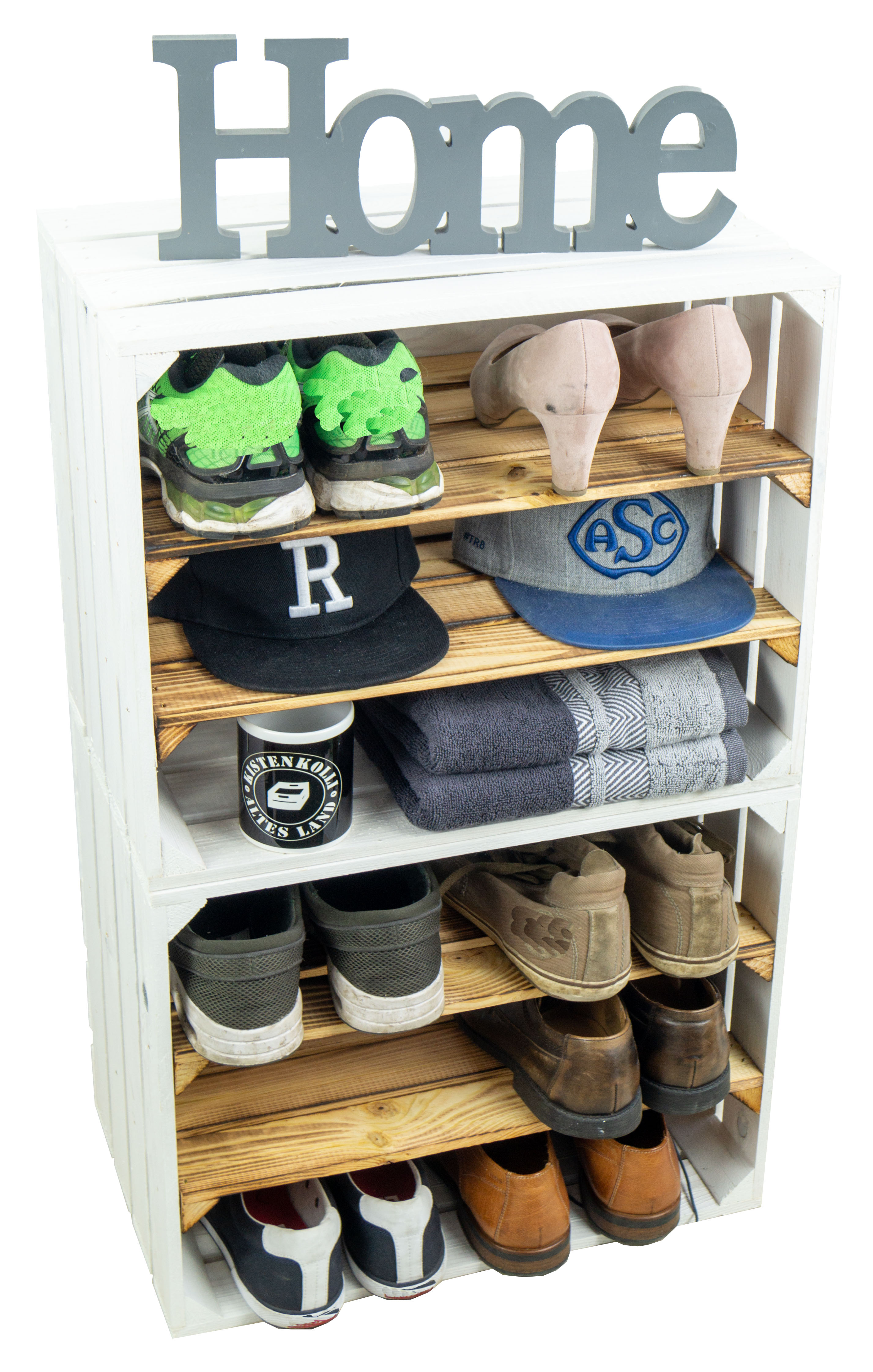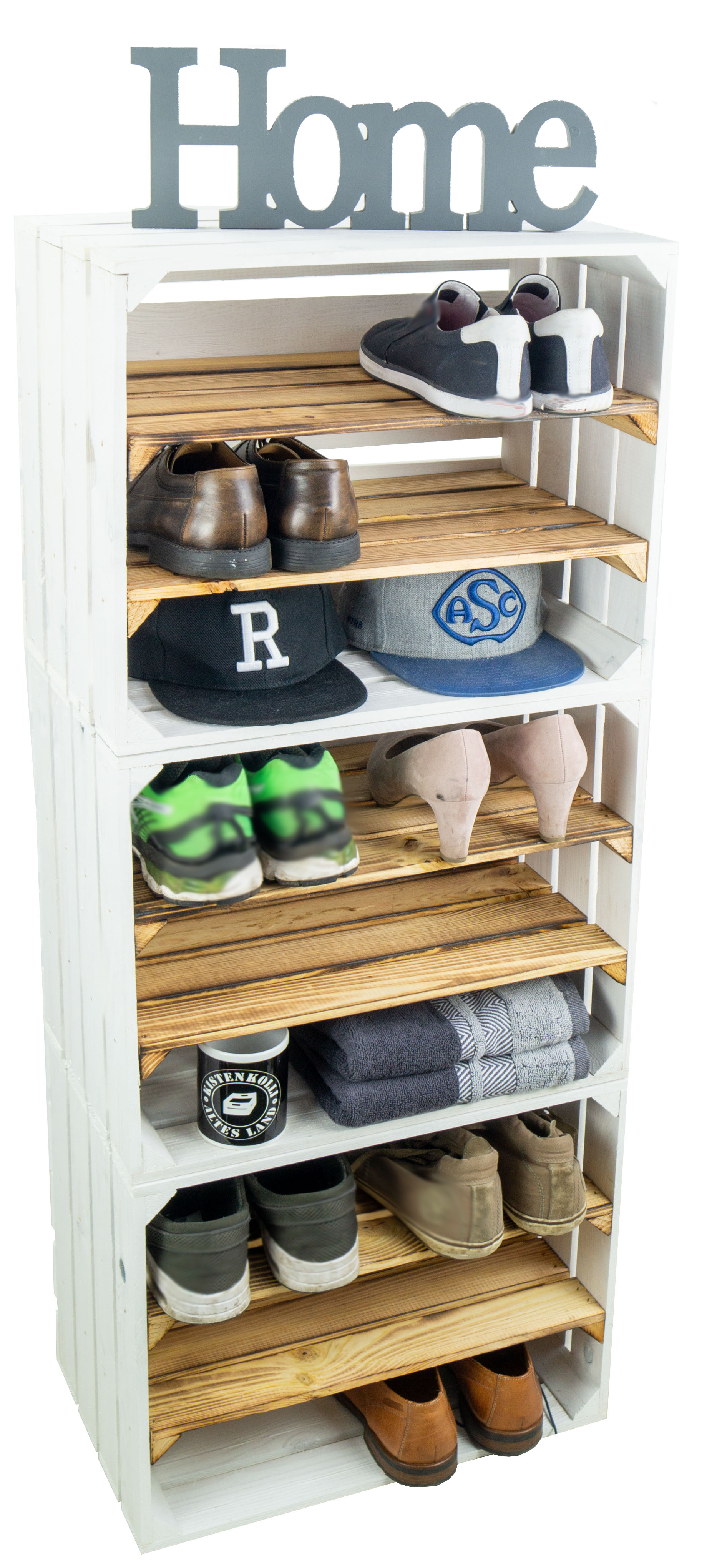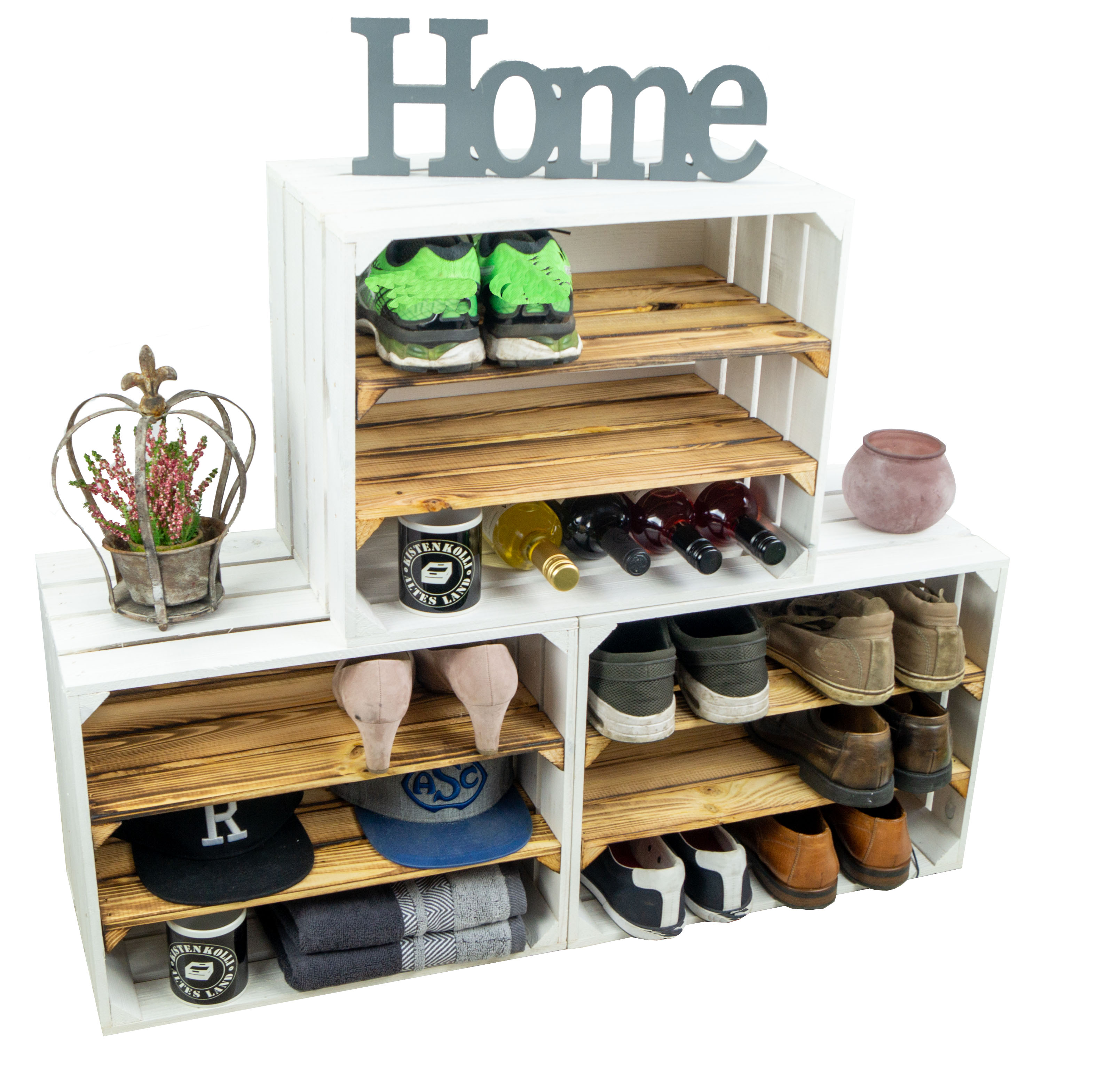 Tolle Regalkisten für Ihr zu Hause, diese neue Design hat nun bereits zwei montierte Mittelbretter in der Kiste, somit noch mehr Stauraum pro Kiste für Ihre Schuhe. Durch die etwas geringere Höhe pro Fach (ca. 12cm) passen Vorzugsweise nur flache Sneaker oder Halbschuhe in die Fächer. Passende Kisten mit einer Quereinlage oder nur einem Mittelbrett für höhere Schuhe finden Sie auch bei uns, so können Sie diese Kisten wunderbar mit unseren anderen Ausführungen kombinieren. Auch als Weinregal oder Weinschrank wunderbar zu benutzen, die Kisten sind stabil genug um diese komplett mit Weinflaschen zu füllen. Wenn man alle drei Kisten übereinander stellt sollte man diese jedoch an der Wand (mit schrauben) sichern um ein mögliches umkippen zu vermeiden. Achtung geflammte Kiste: Vor dem Gebrauch in der Wohnung sollte man den entstandenen Russ durch das flambieren mit einem feuchten Lappen entfernen und ggf. noch mit einem Klarlack lackieren/ versiegeln.