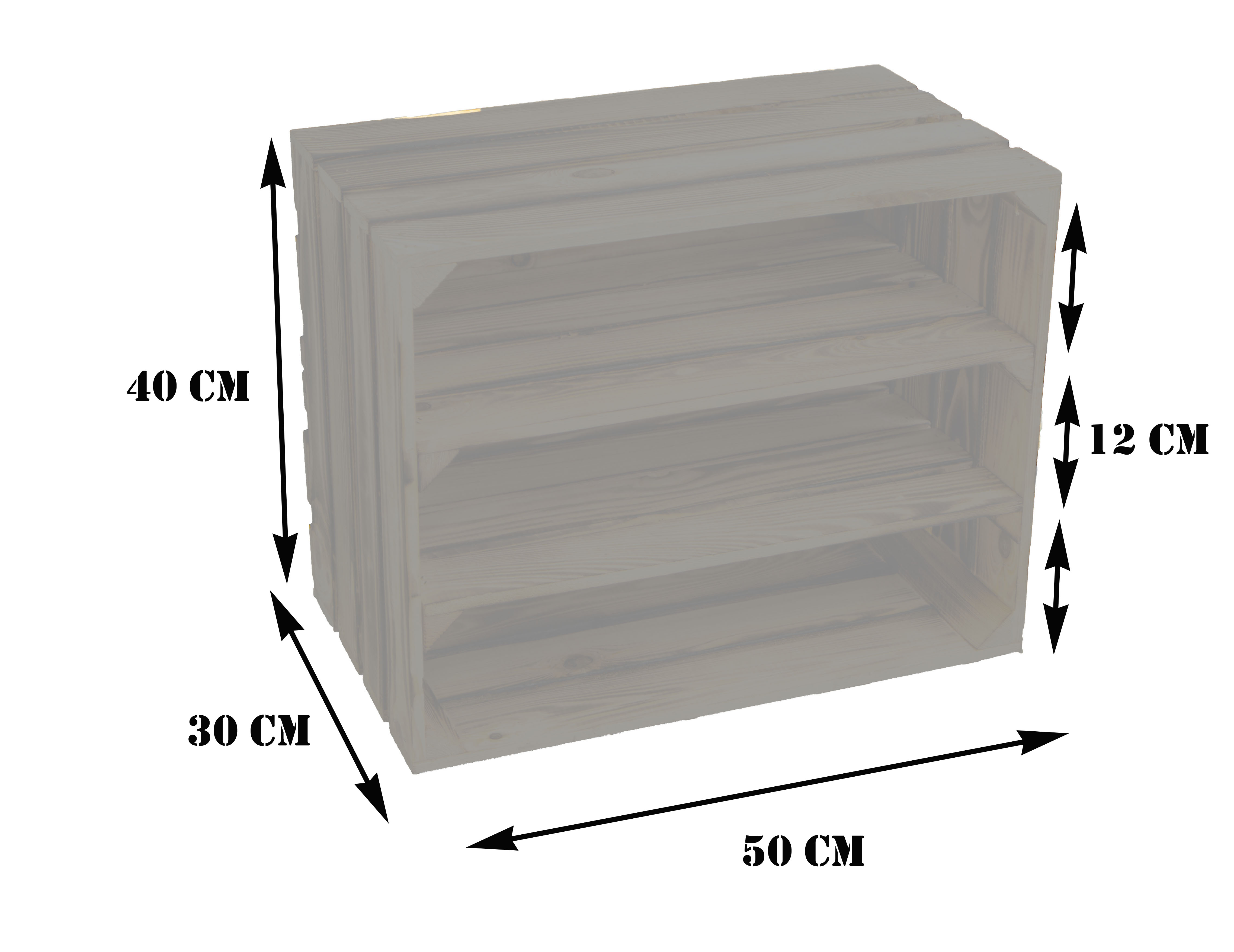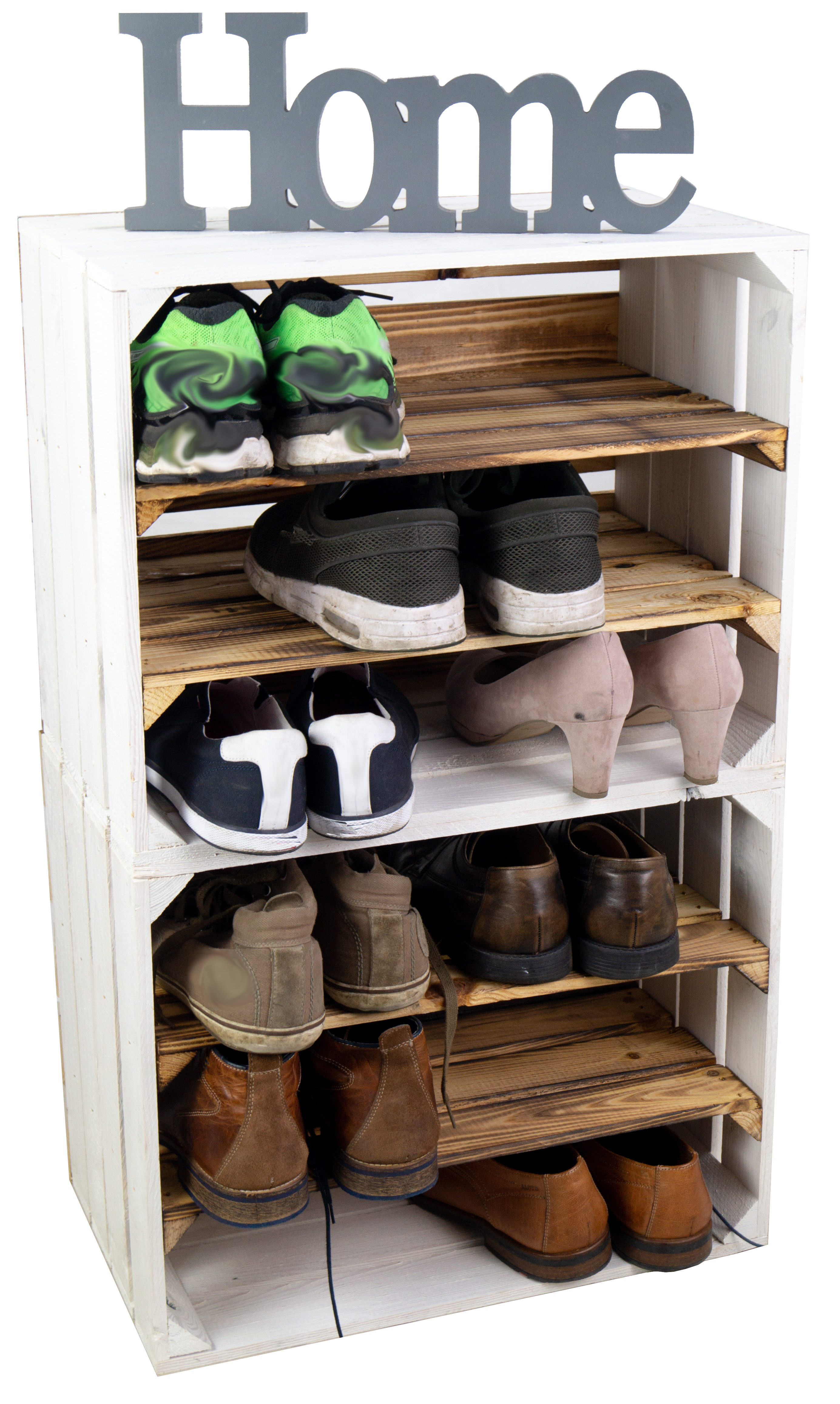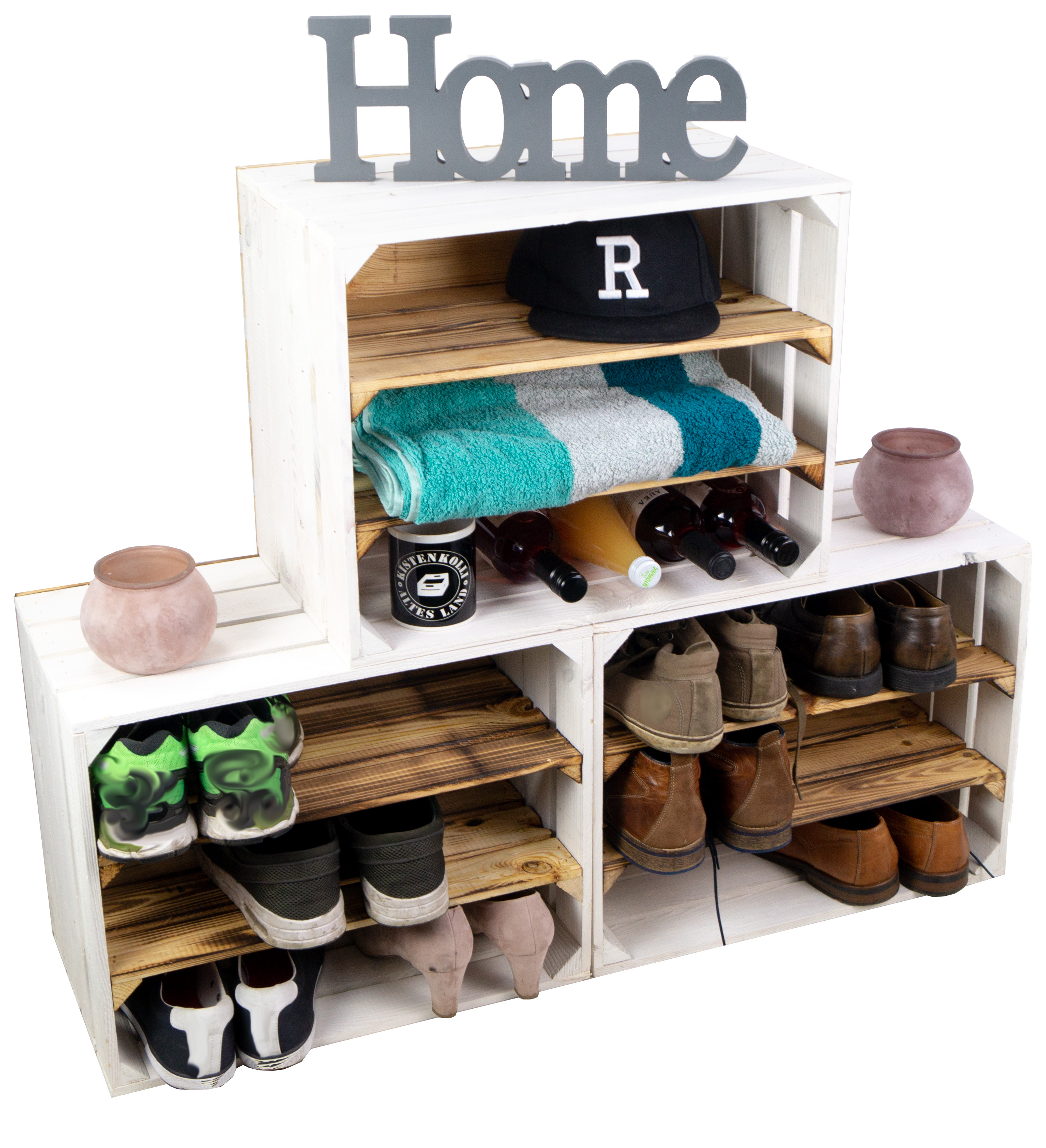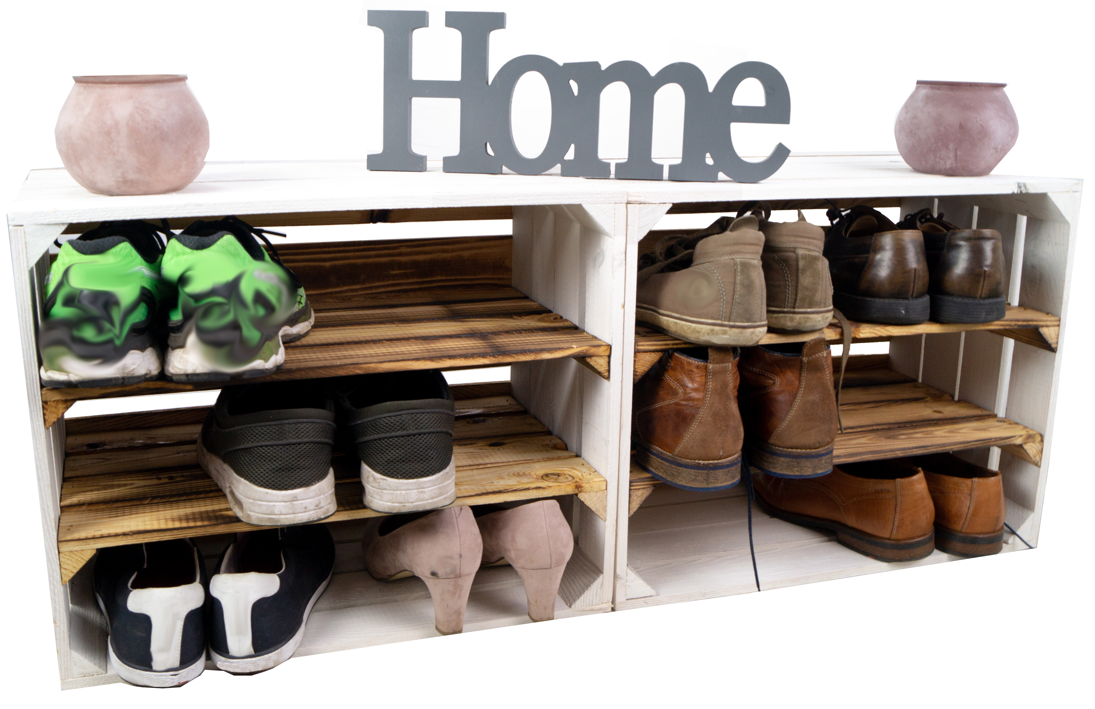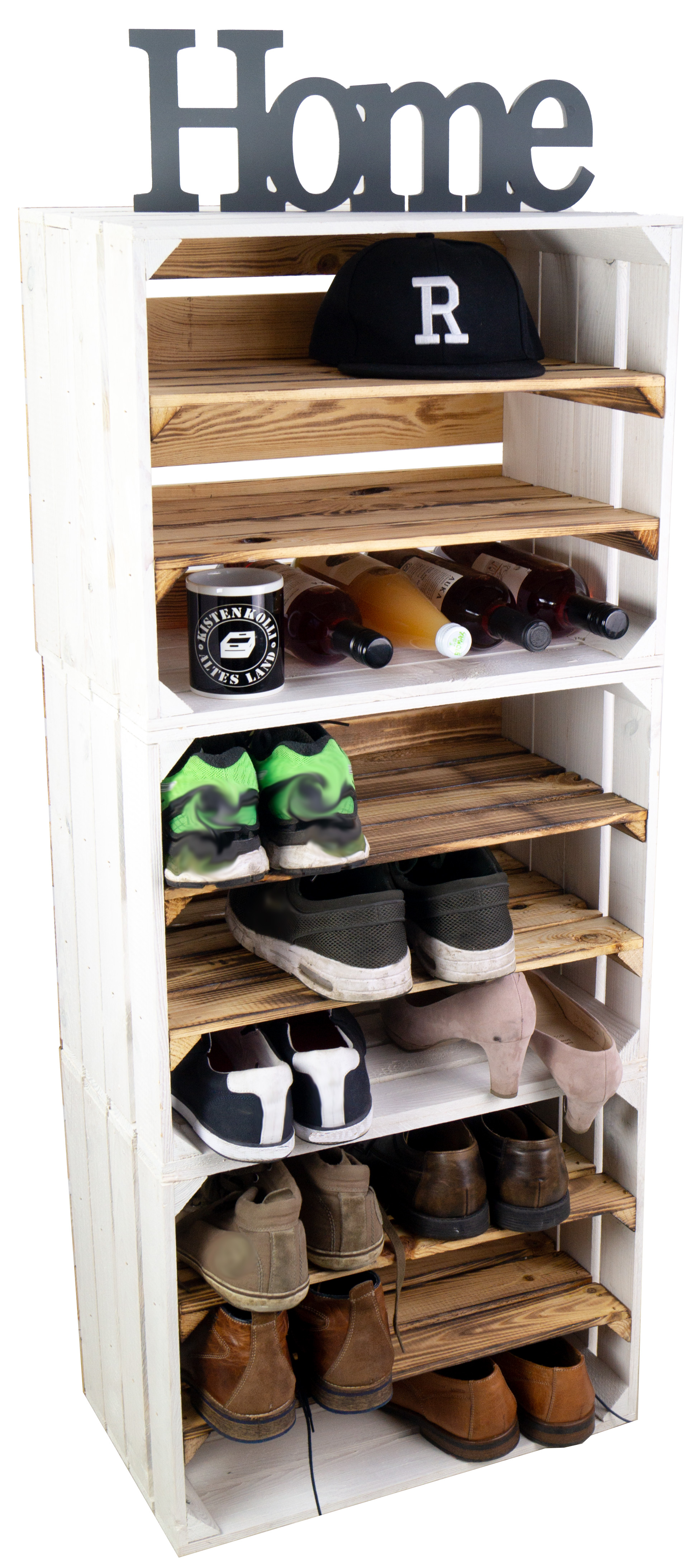 Top Design, modern trifft Vintage Style, diese neue Kombination hat nun bereits zwei montierte Mittelbretter in der Kiste, somit noch mehr Stauraum pro Kiste für Ihre Schuhe. Durch die etwas geringere Höhe pro Fach (ca. 12cm) passen Vorzugsweise nur flache Sneaker oder Halbschuhe in die Fächer. Passende Kisten mit einer Quereinlage oder nur einem Mittelbrett für höhere Schuhe finden Sie auch bei uns, so können Sie diese Kisten wunderbar mit unseren anderen Ausführungen kombinieren. Auch als Weinregal oder Weinschrank wunderbar zu benutzen, die Kisten sind stabil genug um diese komplett mit Weinflaschen zu füllen. Wenn man alle drei Kisten übereinander stellt sollte man diese jedoch an der Wand (mit schrauben) sichern um ein mögliches umkippen zu vermeiden. Achtung geflammte Kiste: Vor dem Gebrauch in der Wohnung sollte man den entstandenen Russ durch das flambieren mit einem feuchten Lappen entfernen und ggf. noch mit einem Klarlack lackieren/ versiegeln.