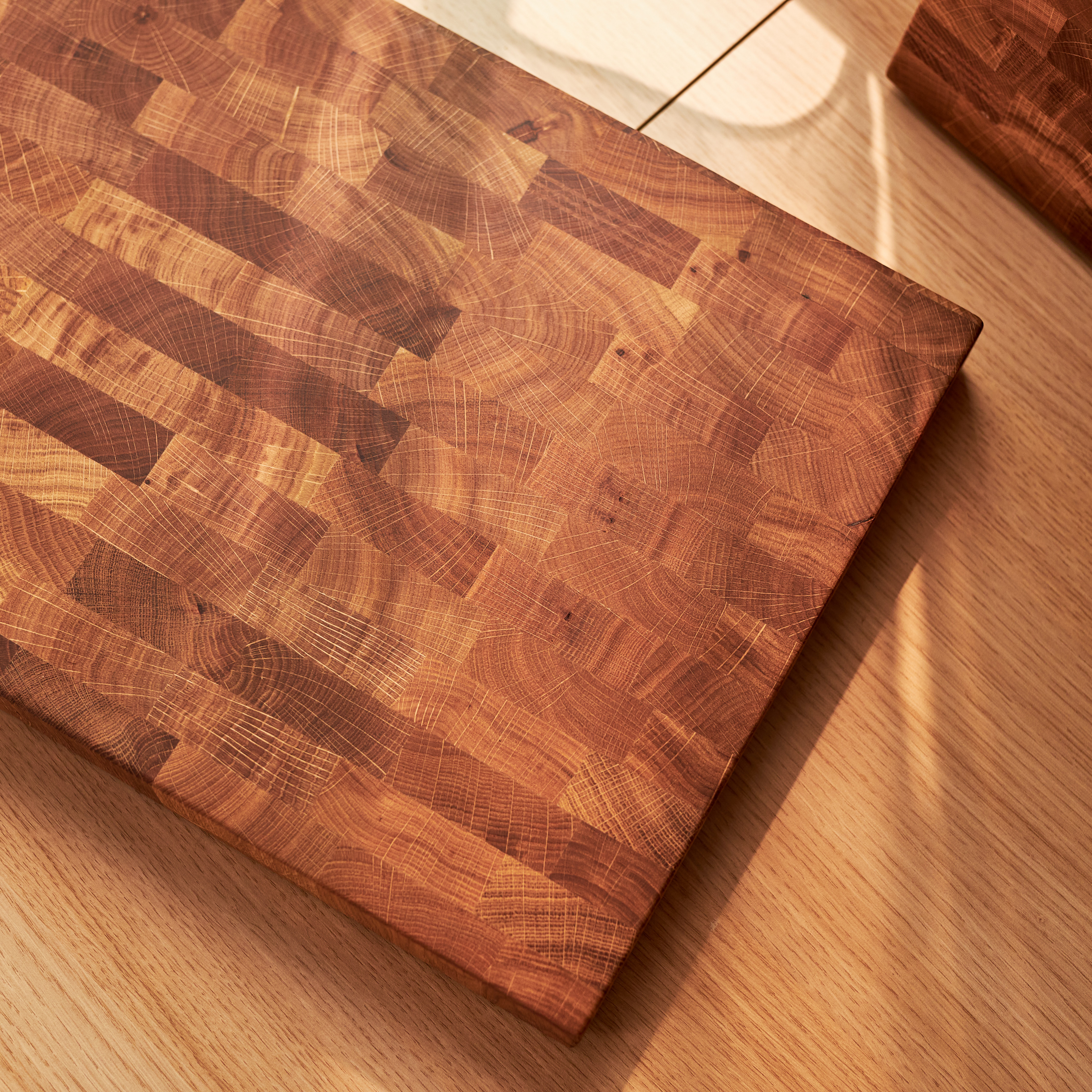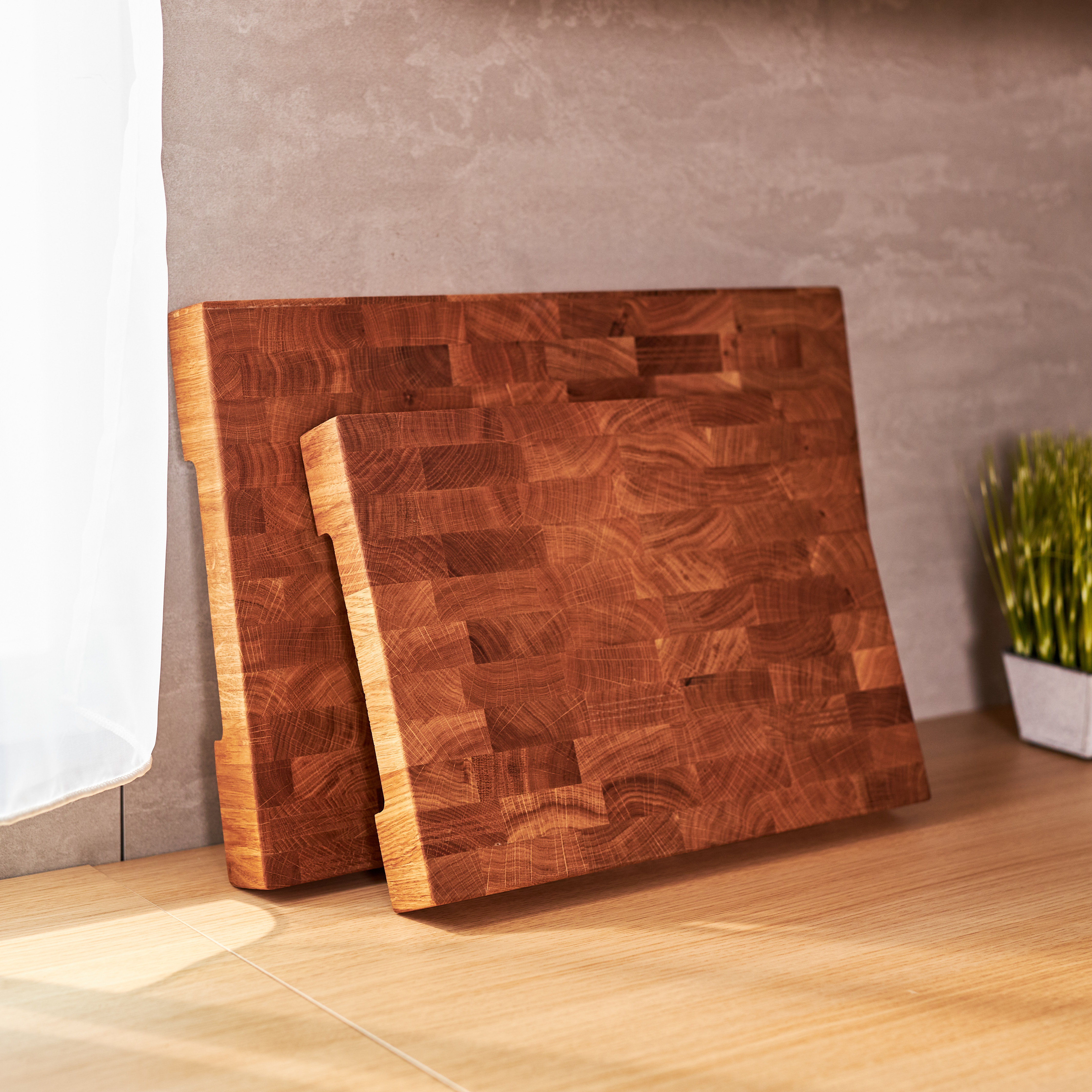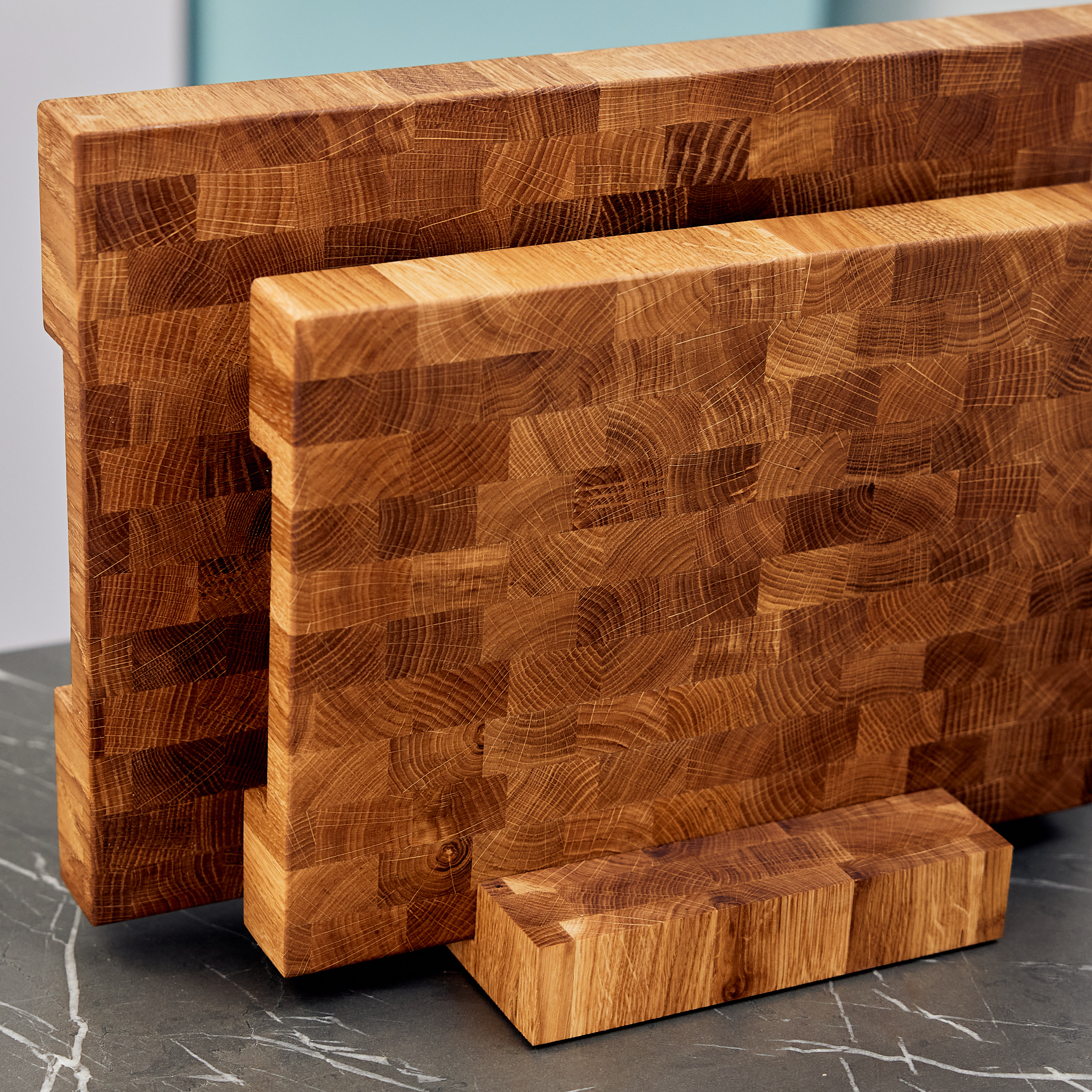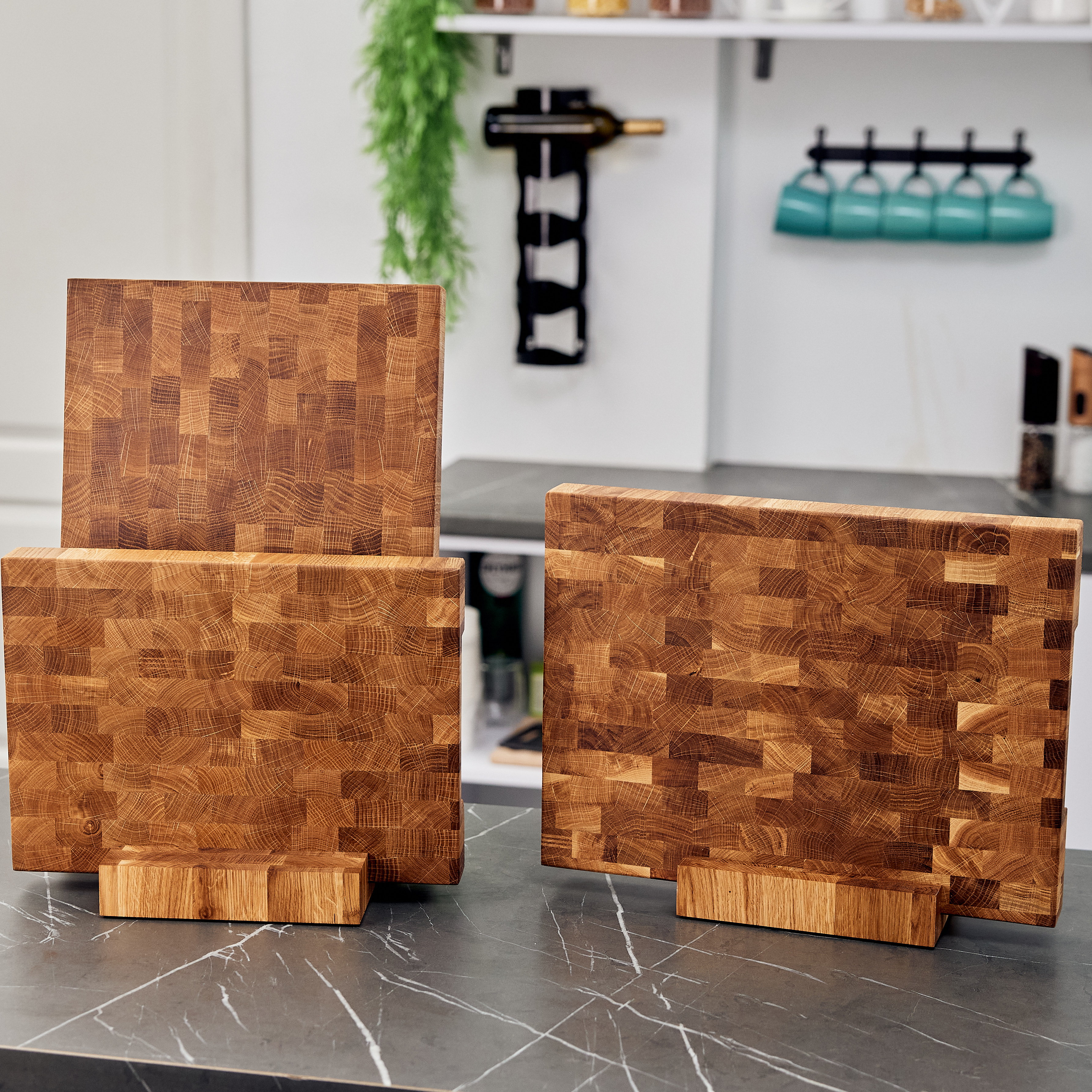 Schneidebrett aus Eichenholz / Stirnholz / Holzbrett mit Untersetzer / Ständer / Frühstücksbrett