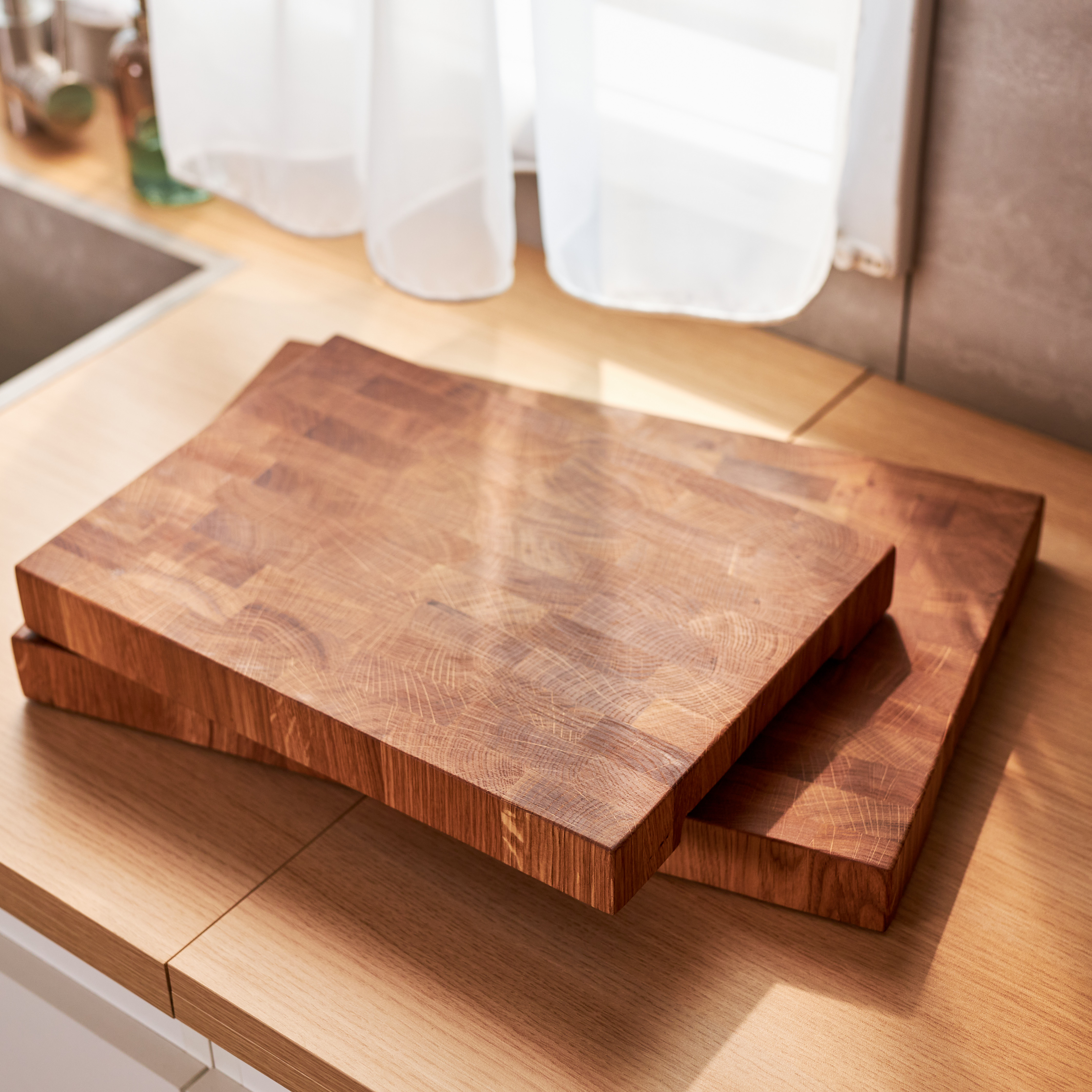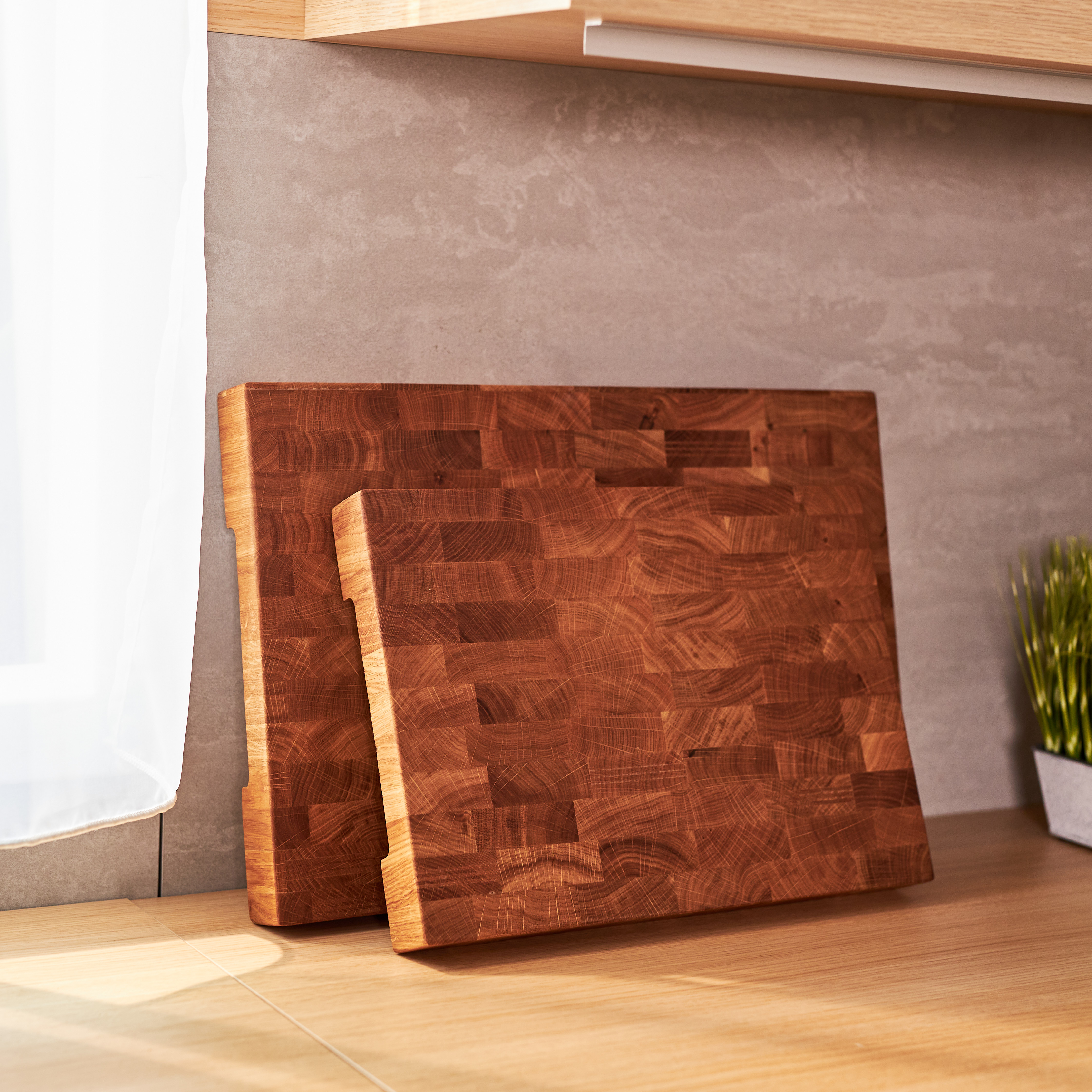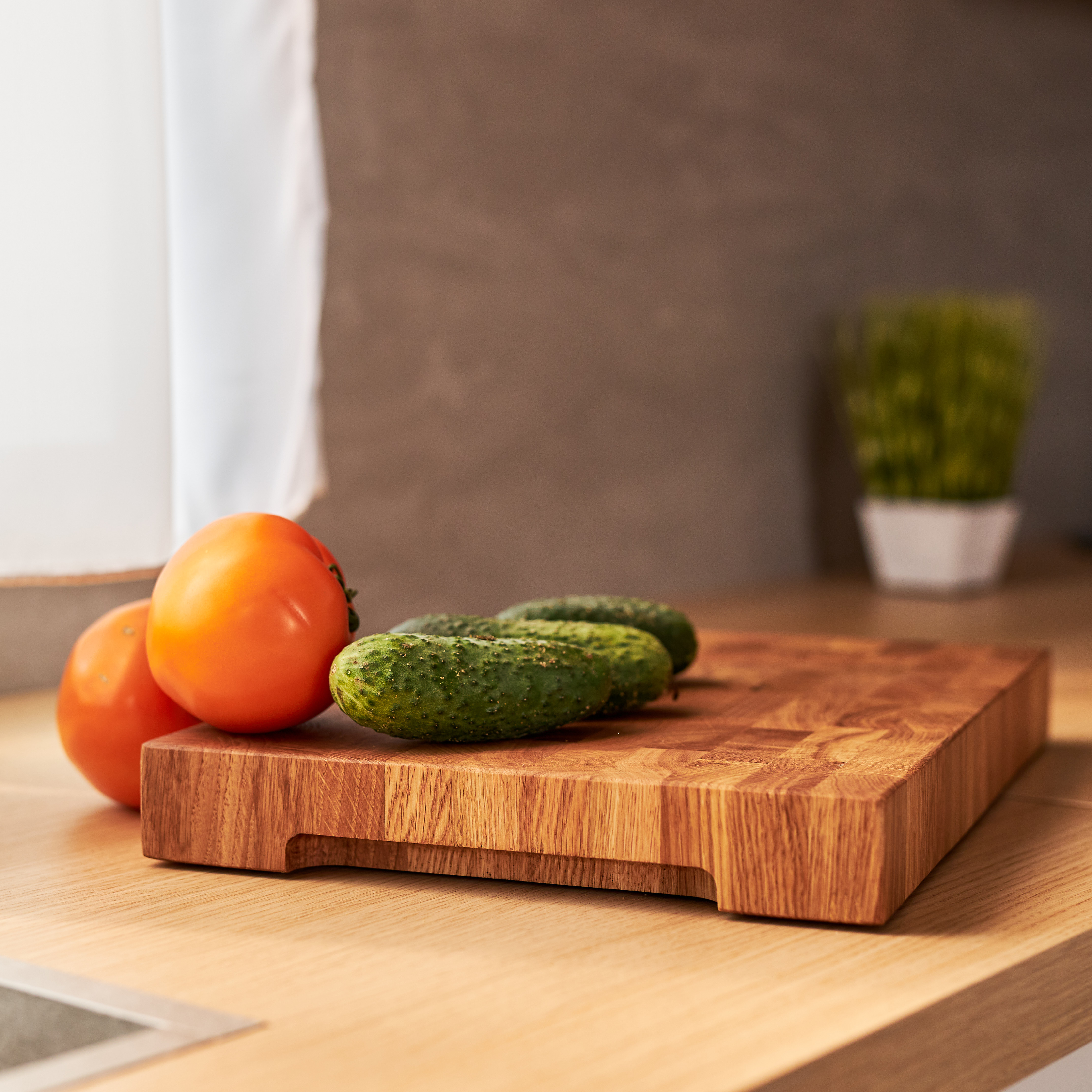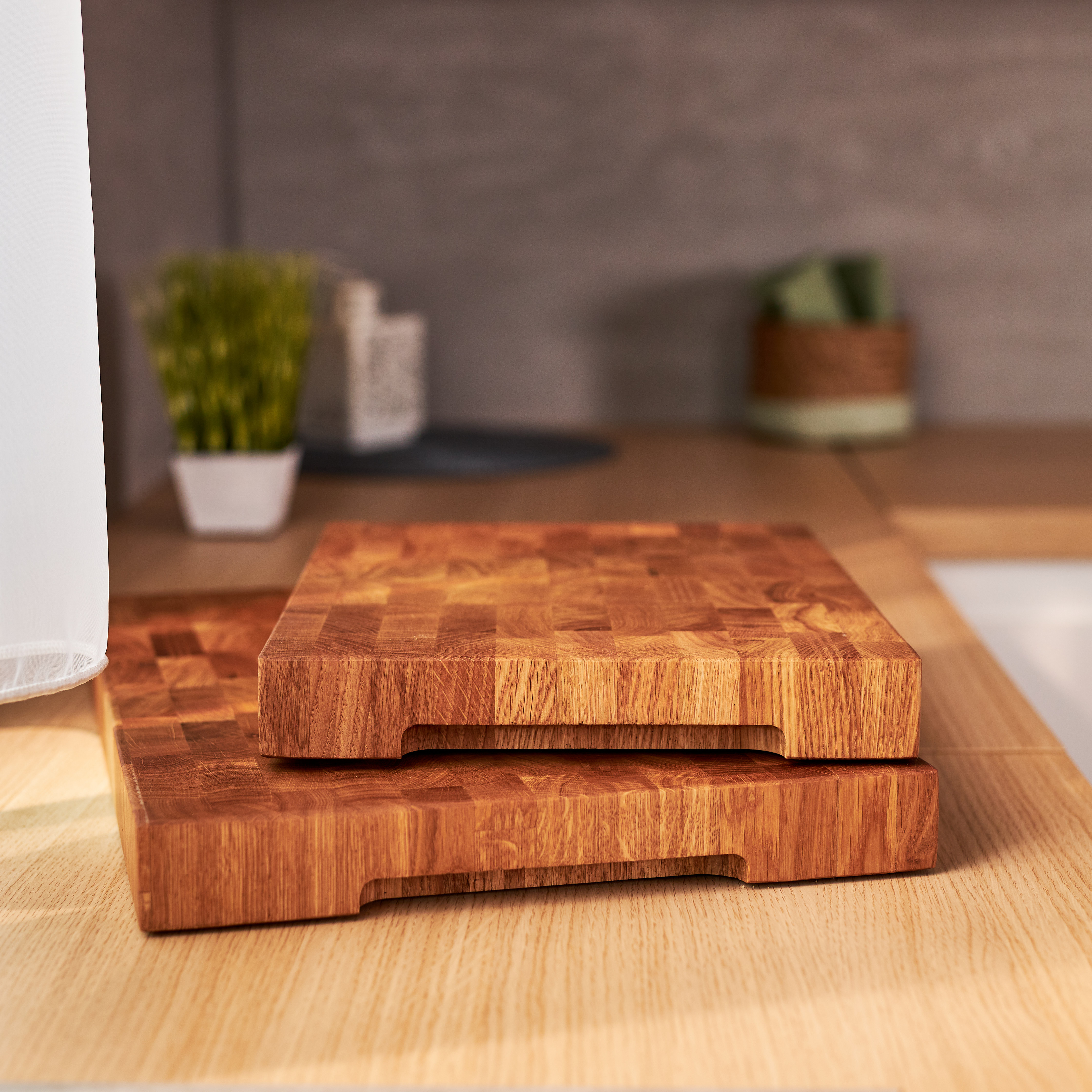 Schneidebrett aus Eichenholz / Stirnholz / Holzbrett mit Untersetzer / Ständer / Frühstücksbrett