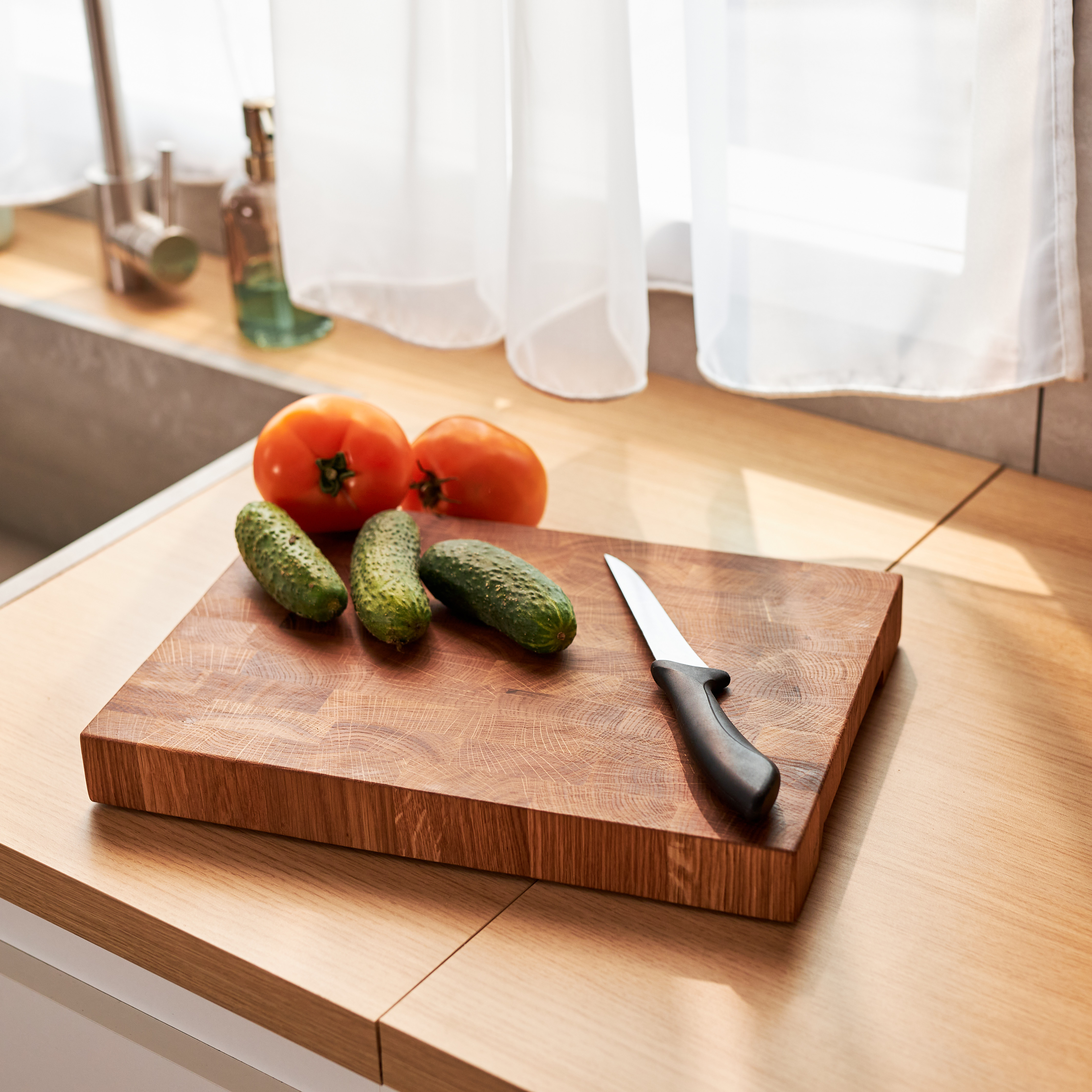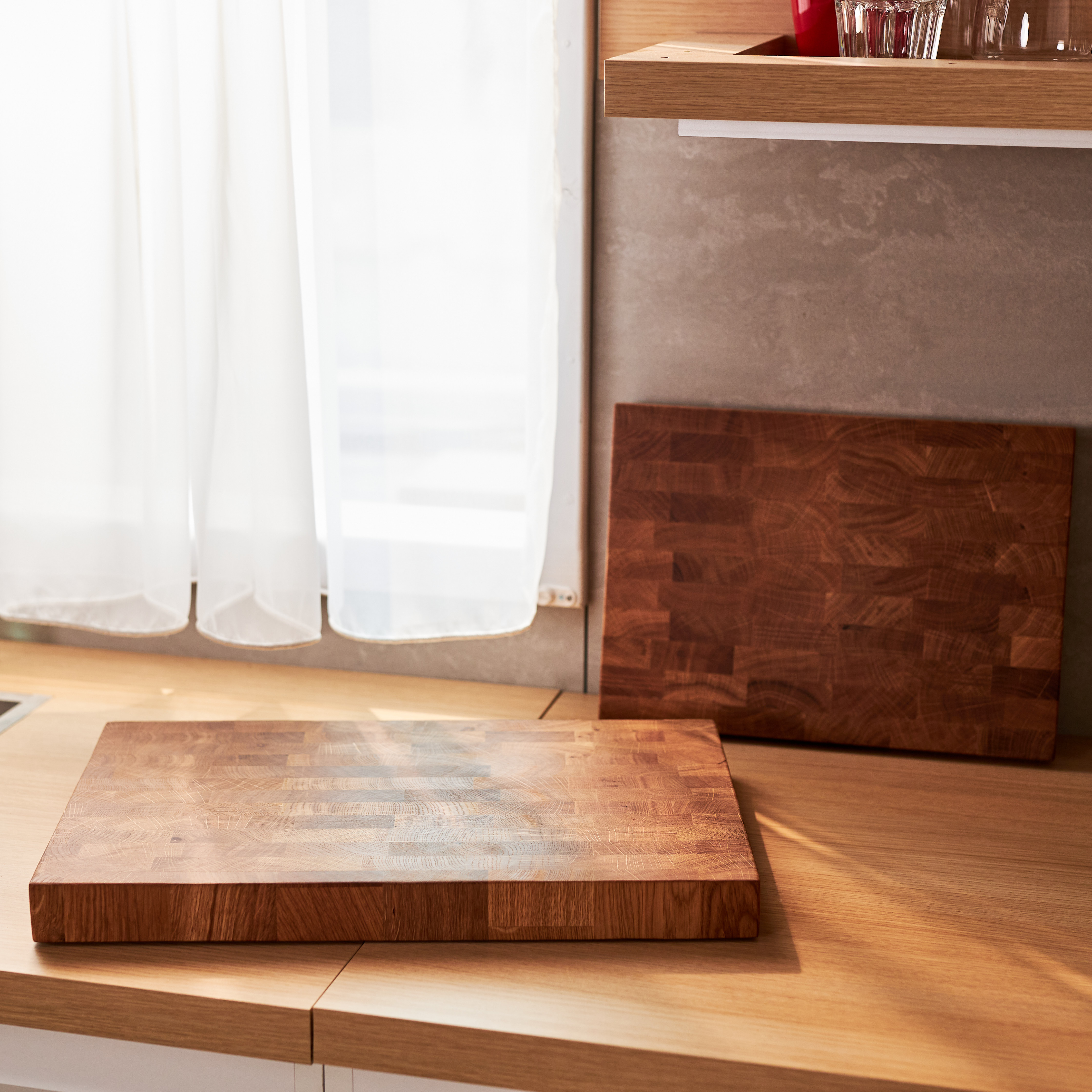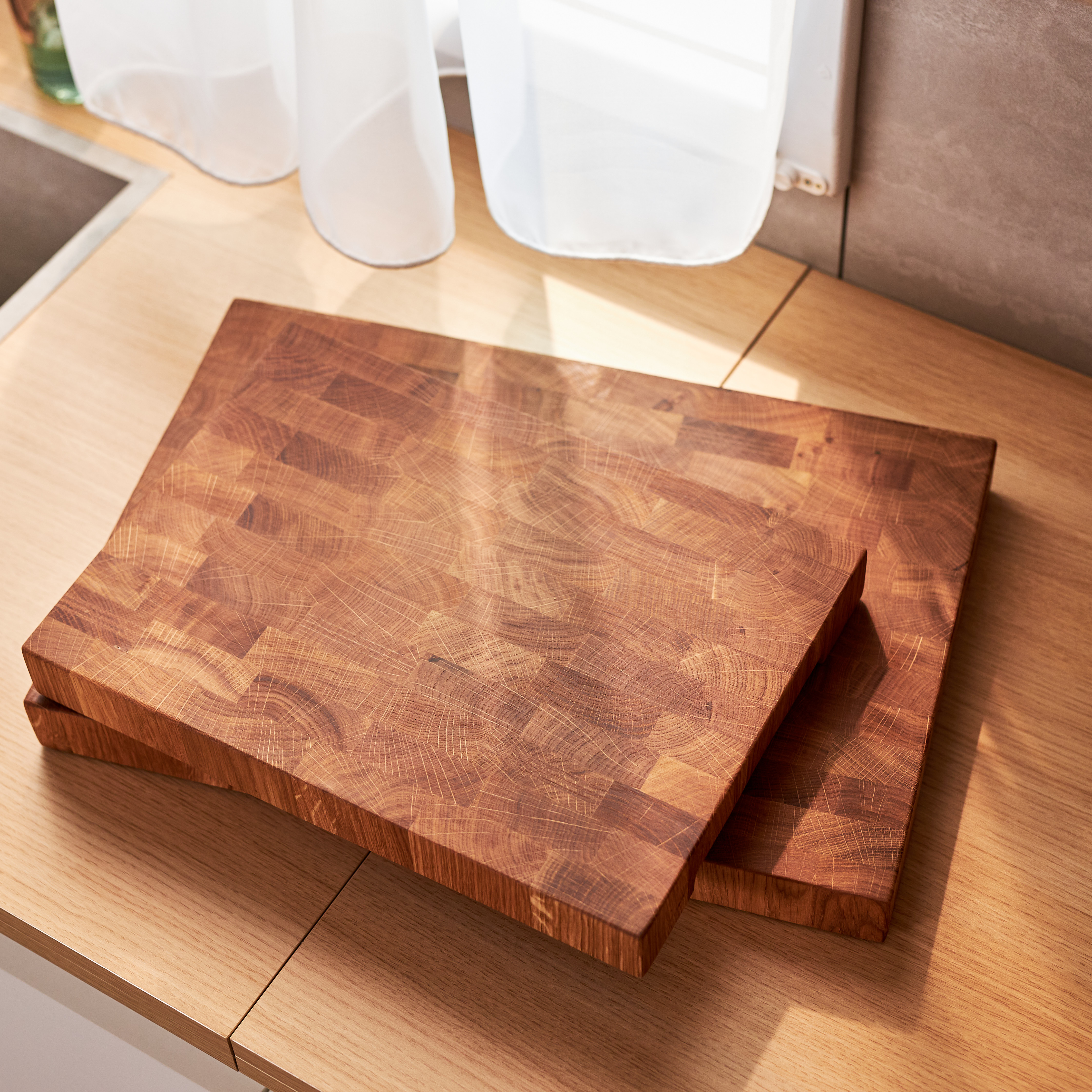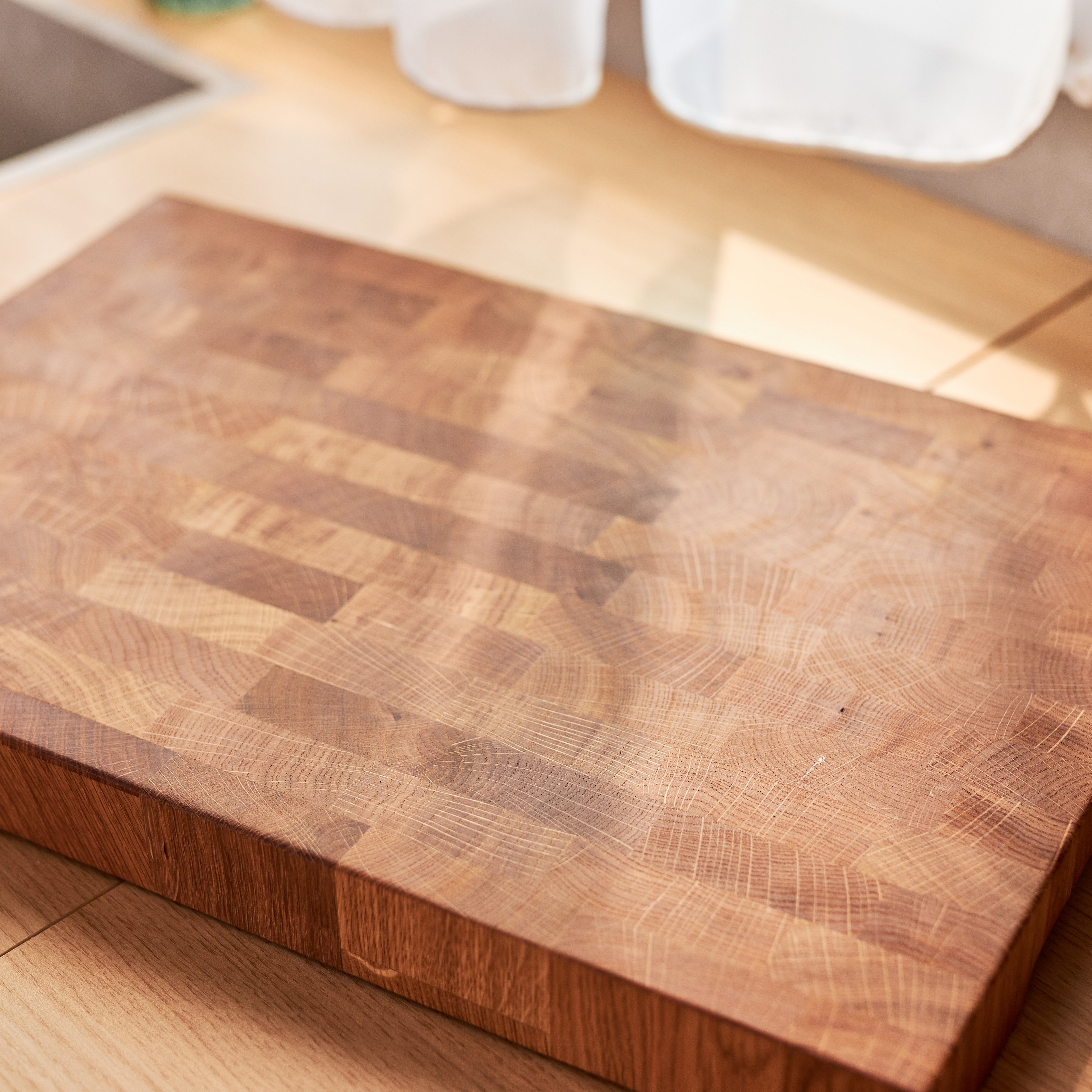 Schneidebrett aus Eichenholz / Stirnholz / Holzbrett mit Untersetzer / Ständer / Frühstücksbrett