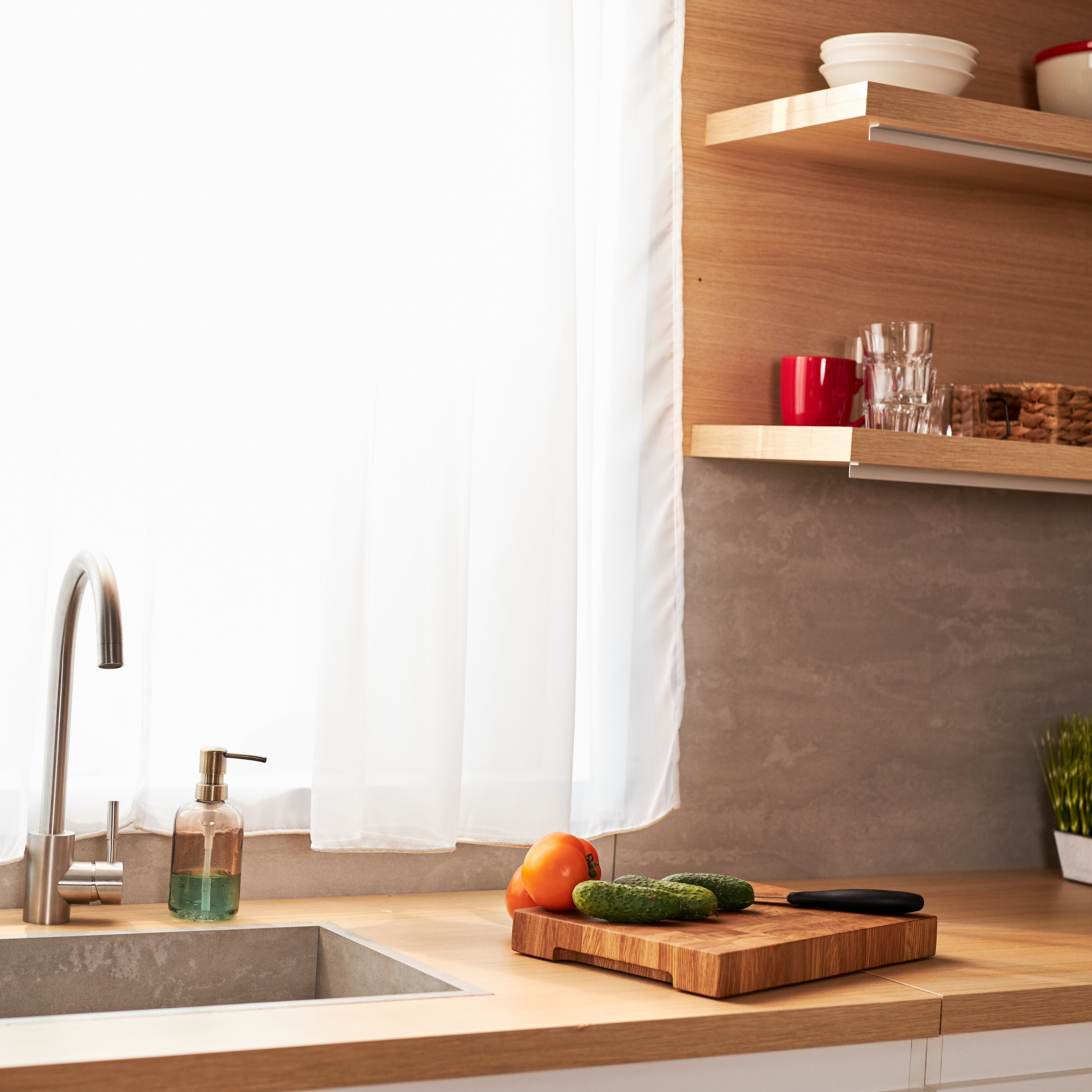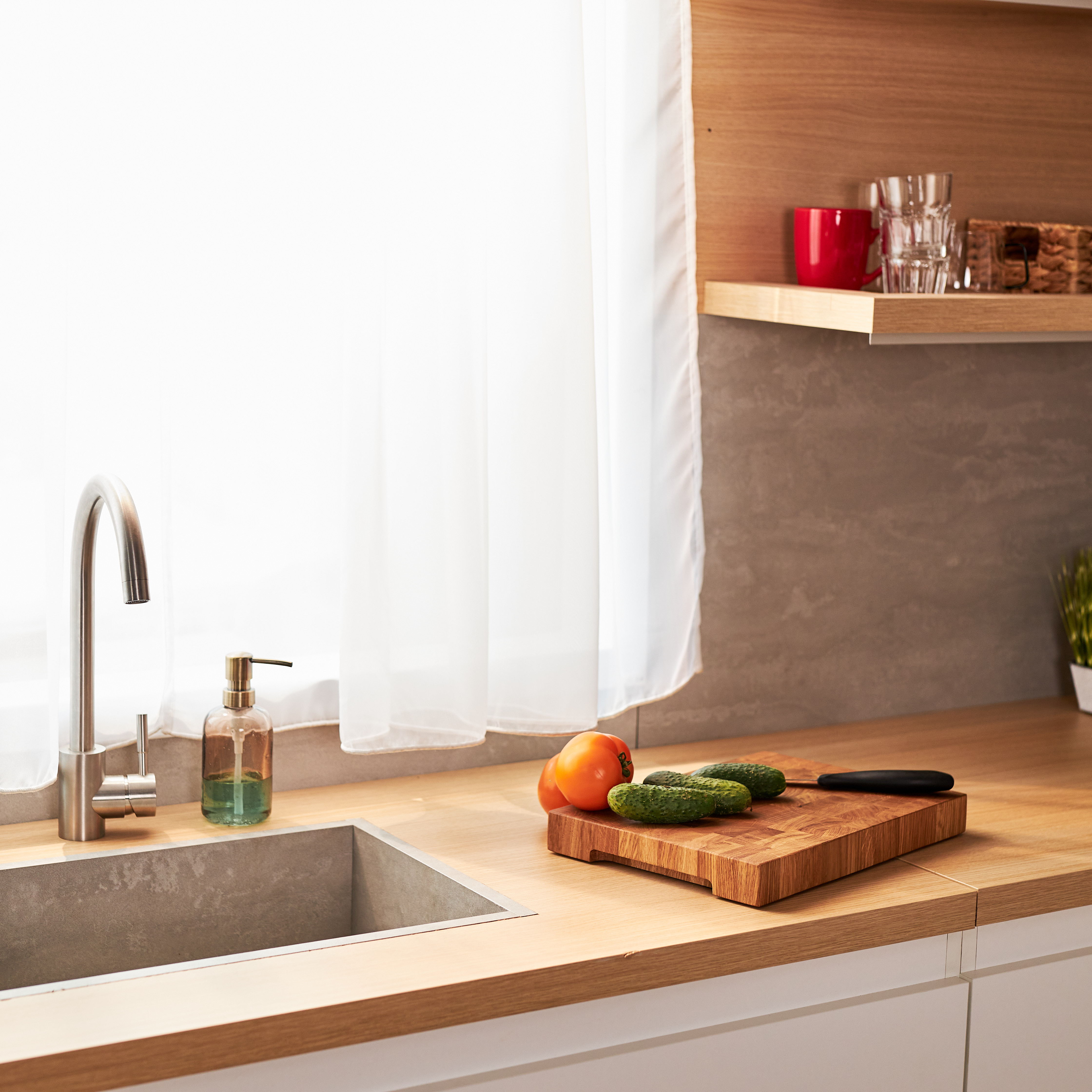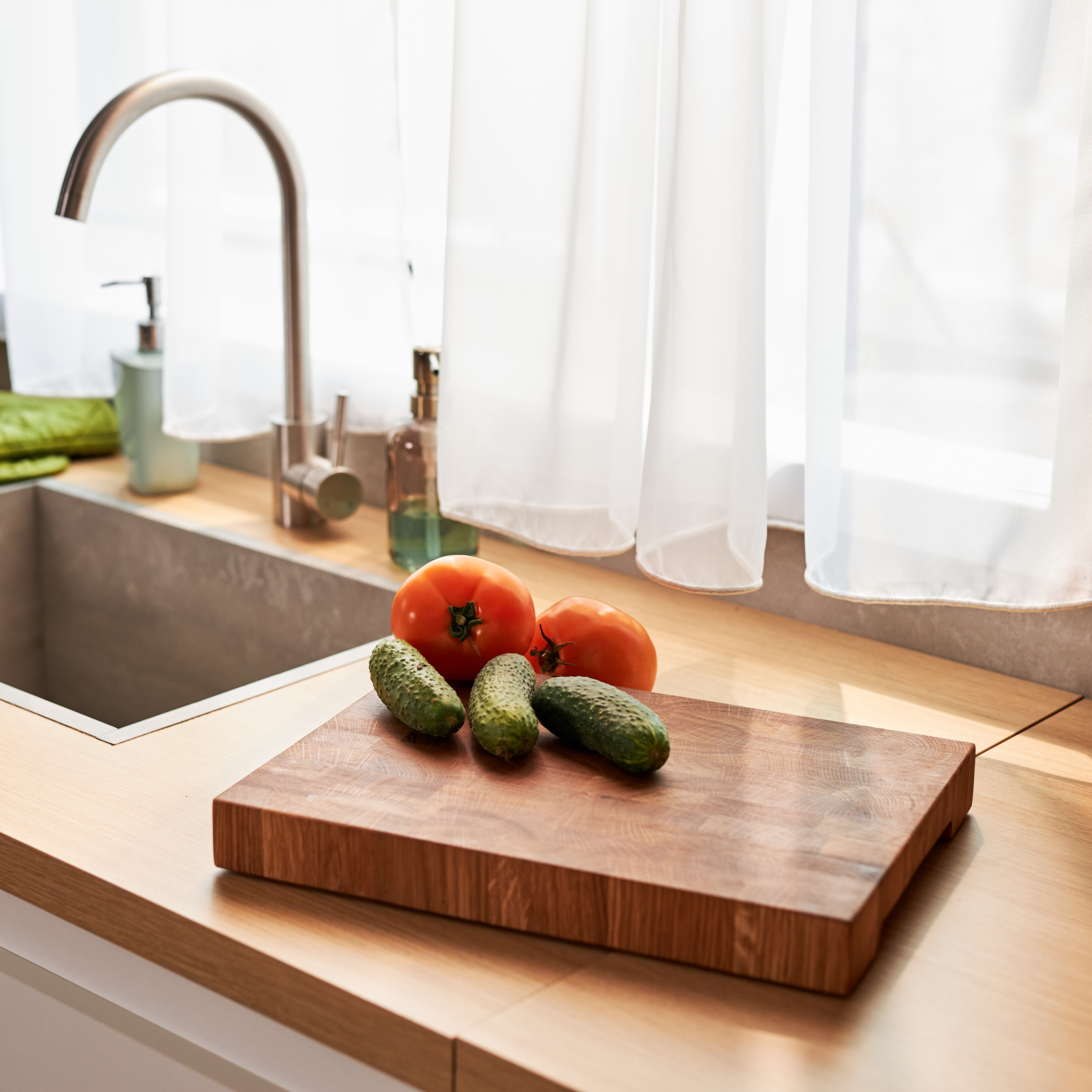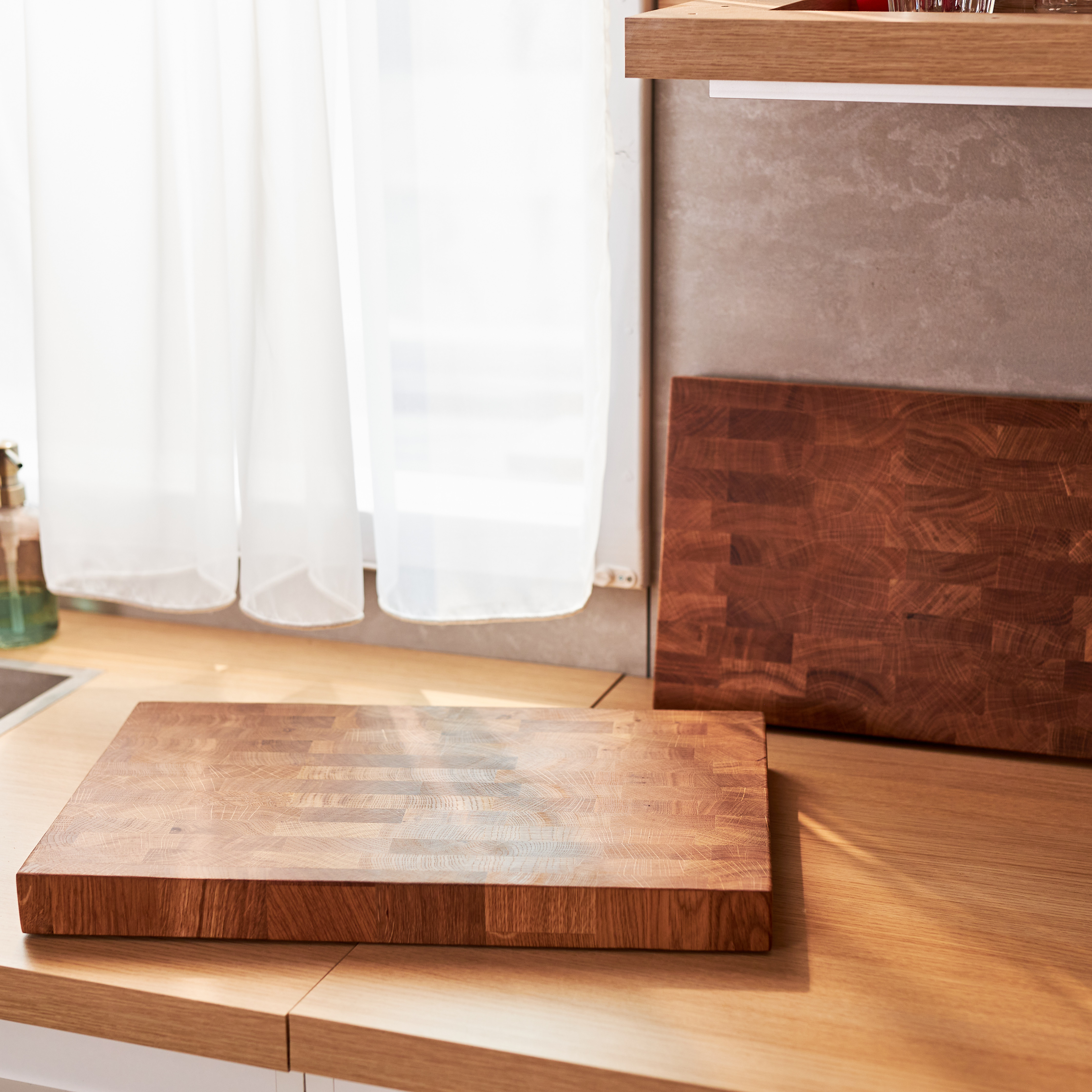 Schneidebrett aus Eichenholz / Stirnholz / Holzbrett mit Untersetzer / Ständer / Frühstücksbrett