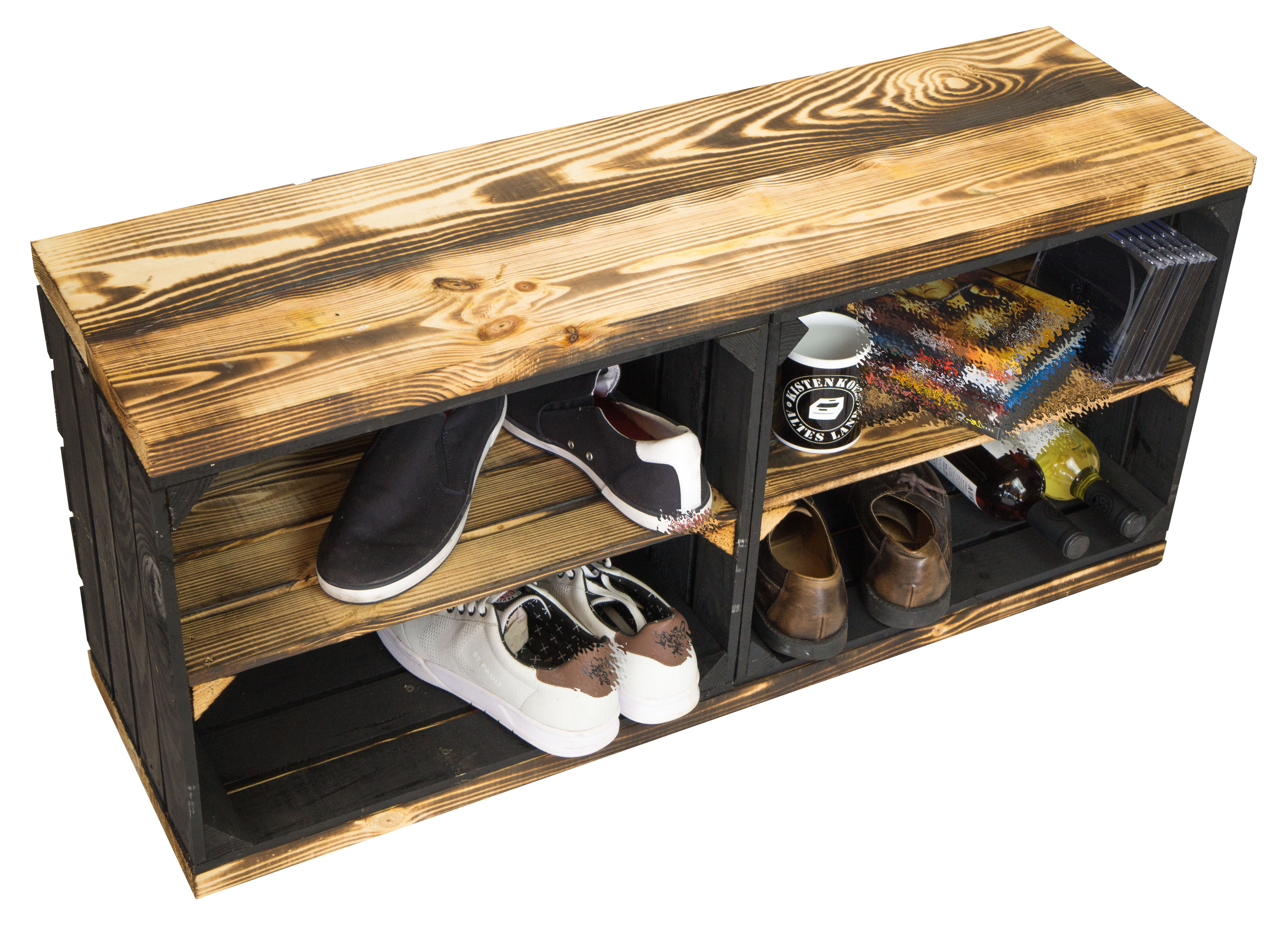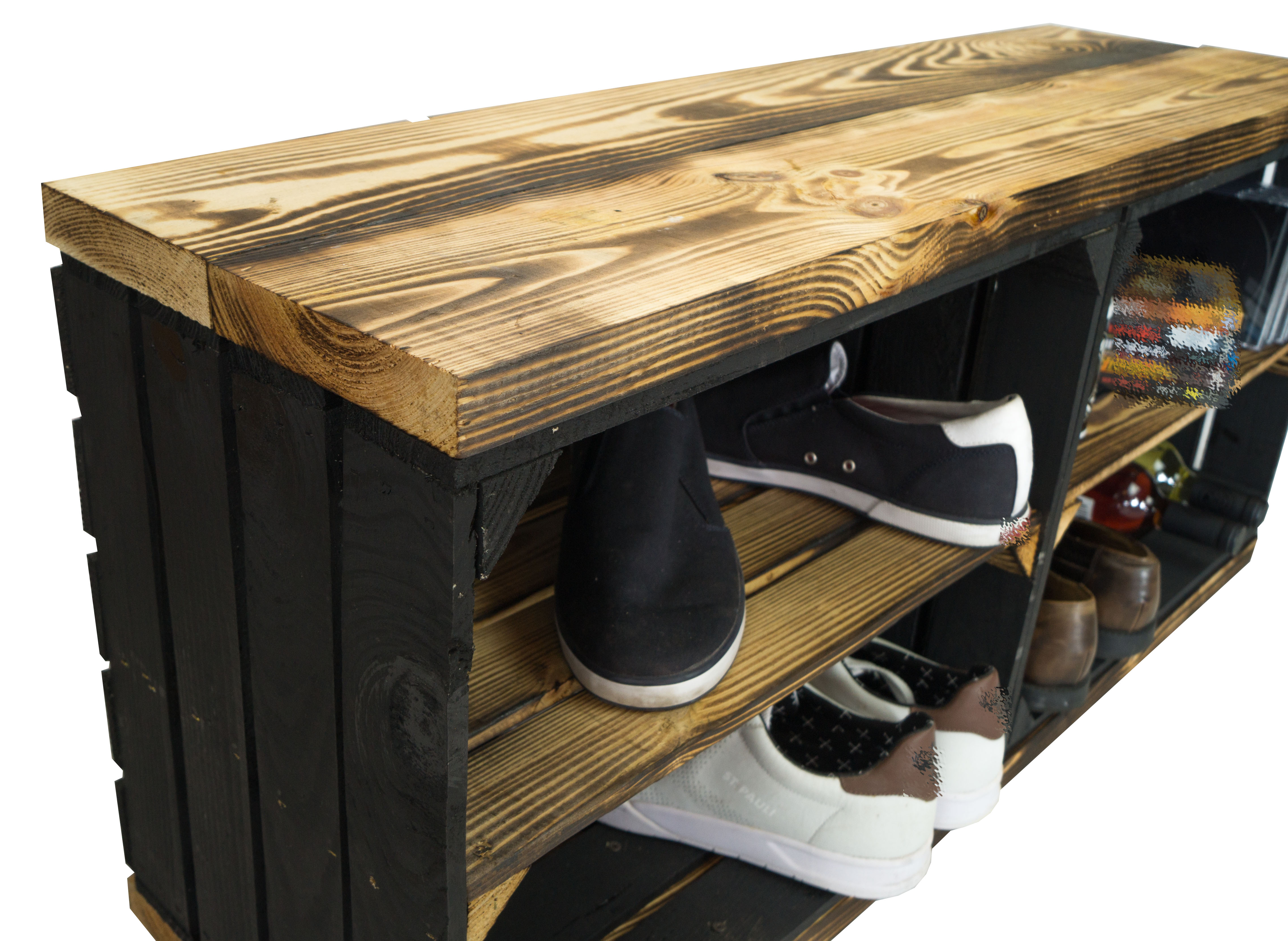 • es können manchmal Unregelmäßigkeiten in der Bemalung auftreten, bitte haben Sie dahingehend Verständnis. Es handelt sich um Obstkisten, die umfunktioniert wurden und somit keine perfekten Furniermöbelstücke sind. Wir verwenden ausschließlich Vollholz, welches natürlich auch mal kleinere Makel haben könnte, demnach gehören Astlöcher auch dazu.