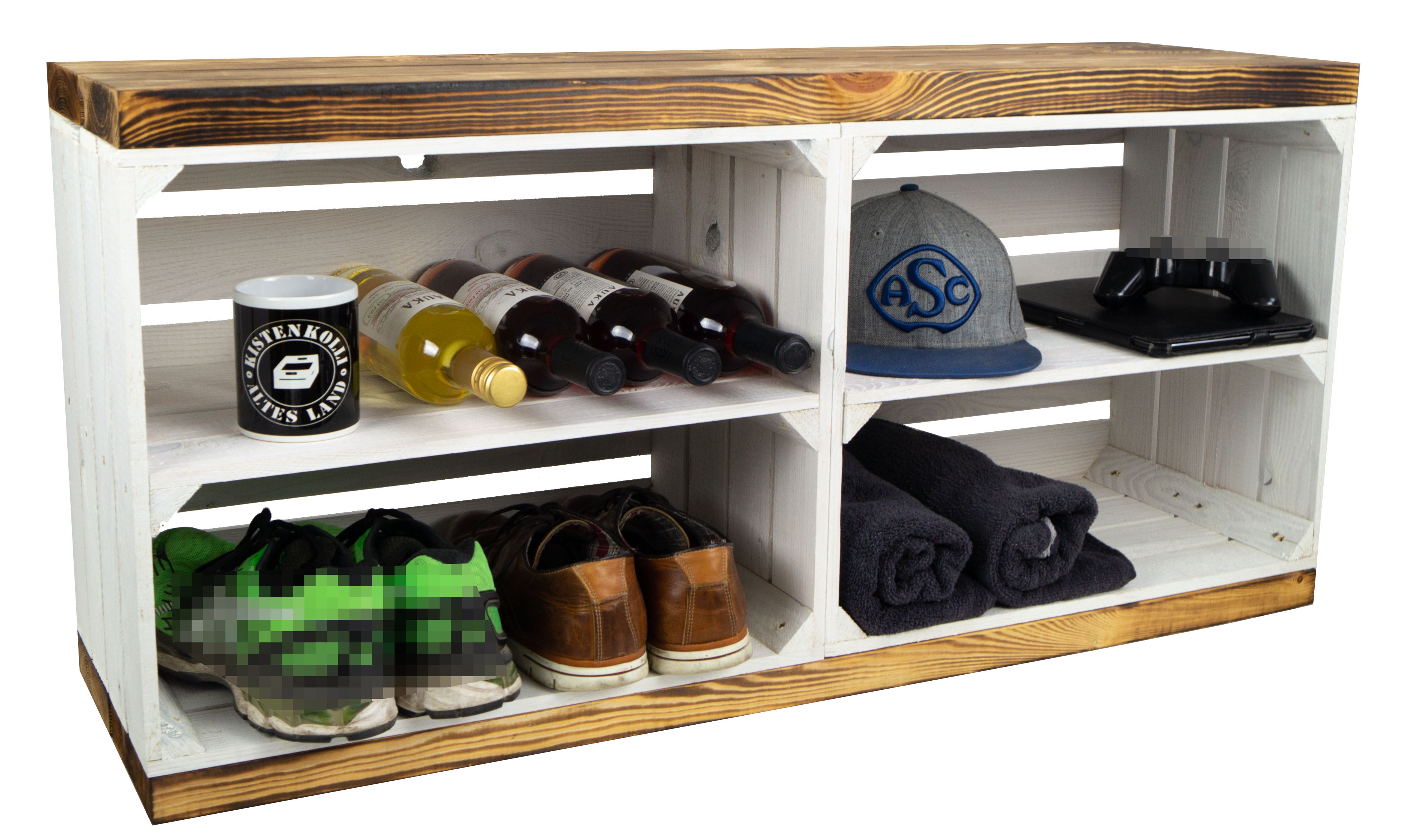 • es können manchmal Unregelmäßigkeiten in der Bemalung auftreten, bitte haben Sie dahingehend Verständnis. Es handelt sich um Obstkisten, die umfunktioniert wurden und somit keine perfekten Furniermöbelstücke sind. Wir verwenden ausschließlich Vollholz, welches natürlich auch mal kleinere Makel haben könnte, demnach gehören Astlöcher auch dazu.