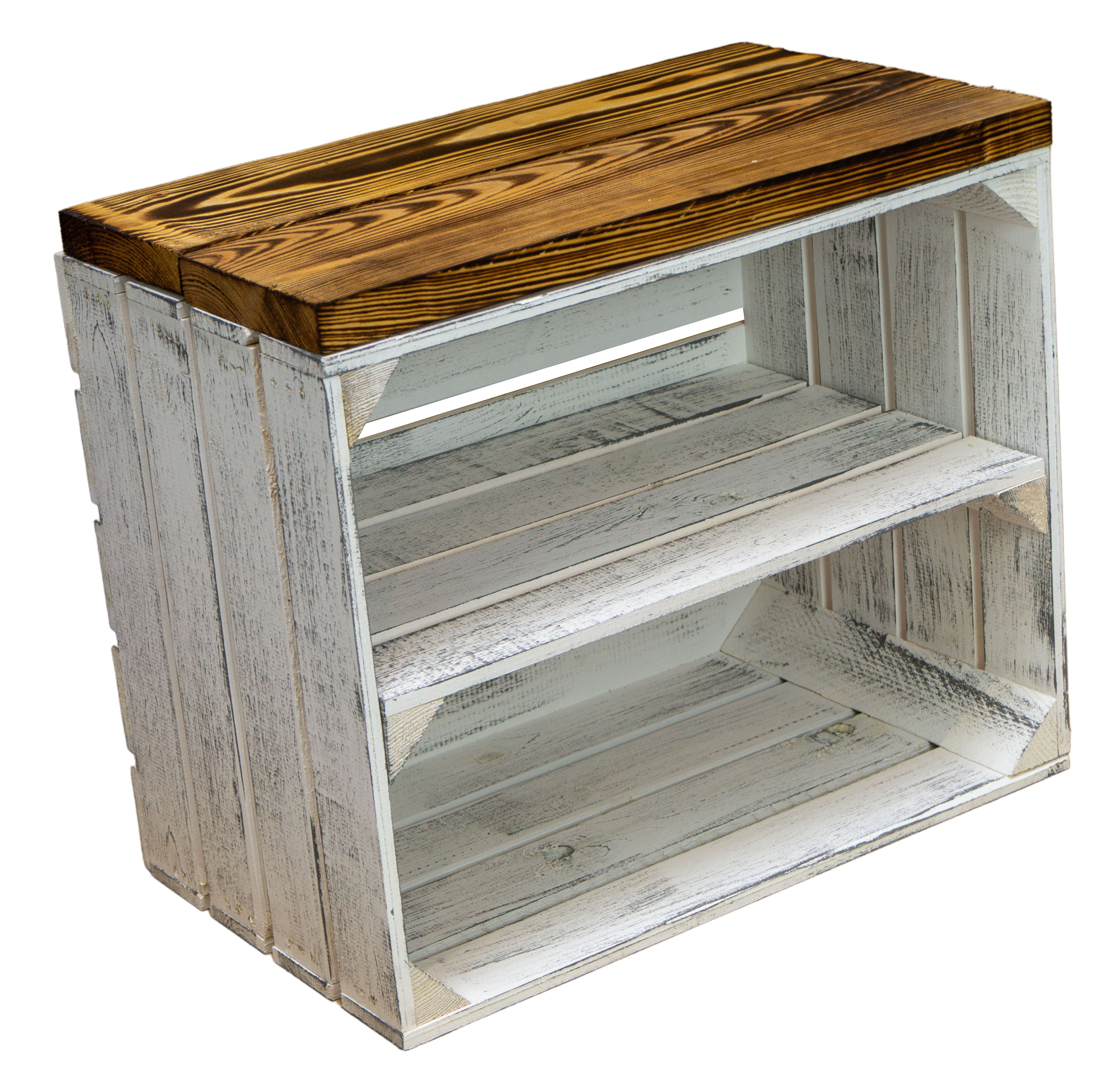 Neue shabby weiße Obstkiste mit Mittelbrett "LÄNGS" mit massiver Holzplanke