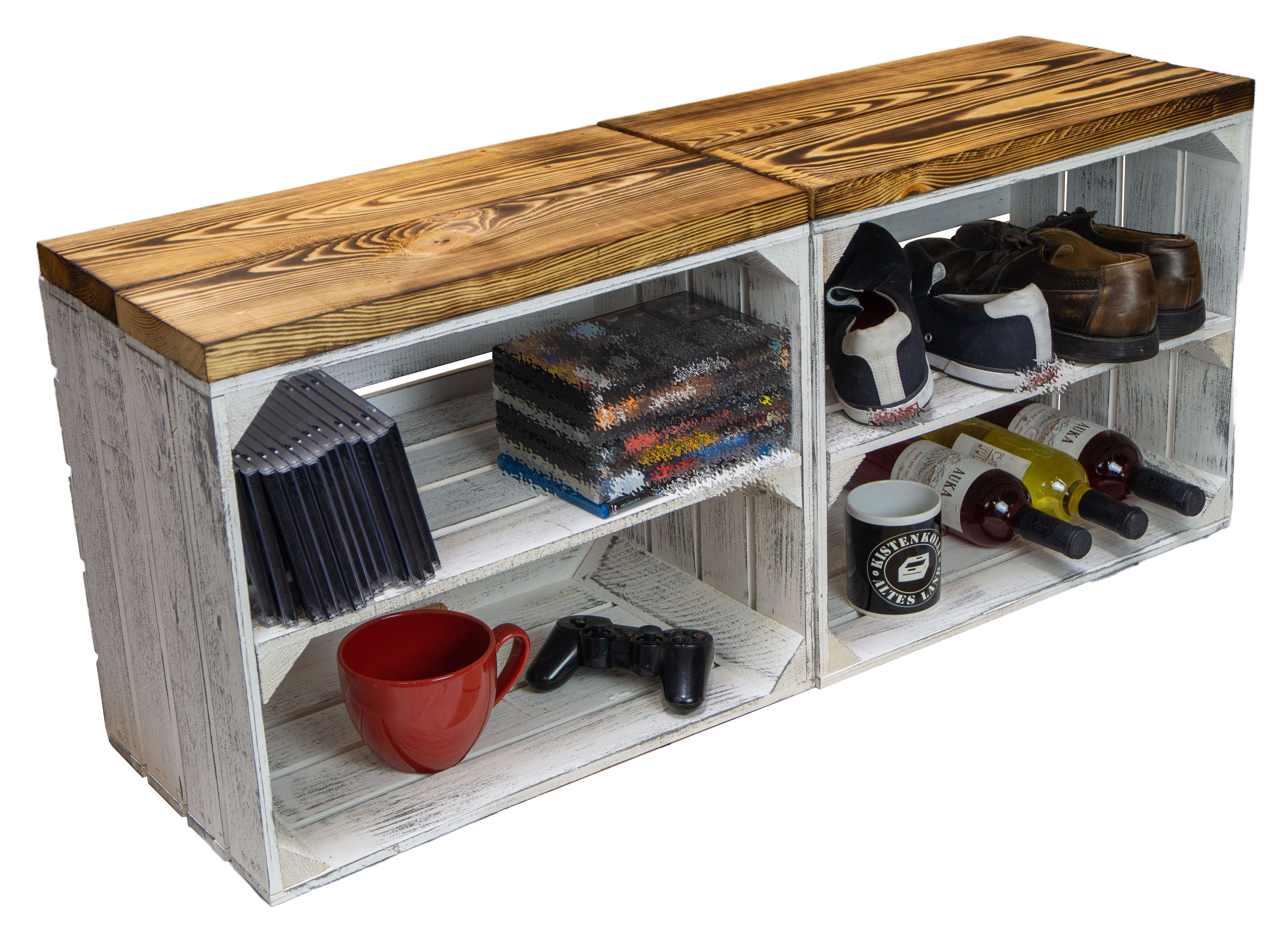 Die Shabby weisse Weinkiste mit einem langen Mittelbrett (herausnehmbar) für die effektive Nutzung auf kleinstem Raum. Für die Befestigung der Mittelbretter liefern wir kleinere Pins mit, die vorab mit einem kleinen Hammer in die vorgesehen Löcher installiert werden müssen. Dadurch können Sie das Mittelbrett nach belieben einlegen oder einfach weglassen. Nutzbar als Regal, Möbel Abstellmöglichkeit oder für den Garten bzw. Balkon. Die Johanna mit der zusätzlichen montierten Planken machen die Kisten sehr stabil, sodass man problemlos diese Kistenvariante auch als Sitzkiste benutzen kann. Plankenstärke ca 2-3 cm.