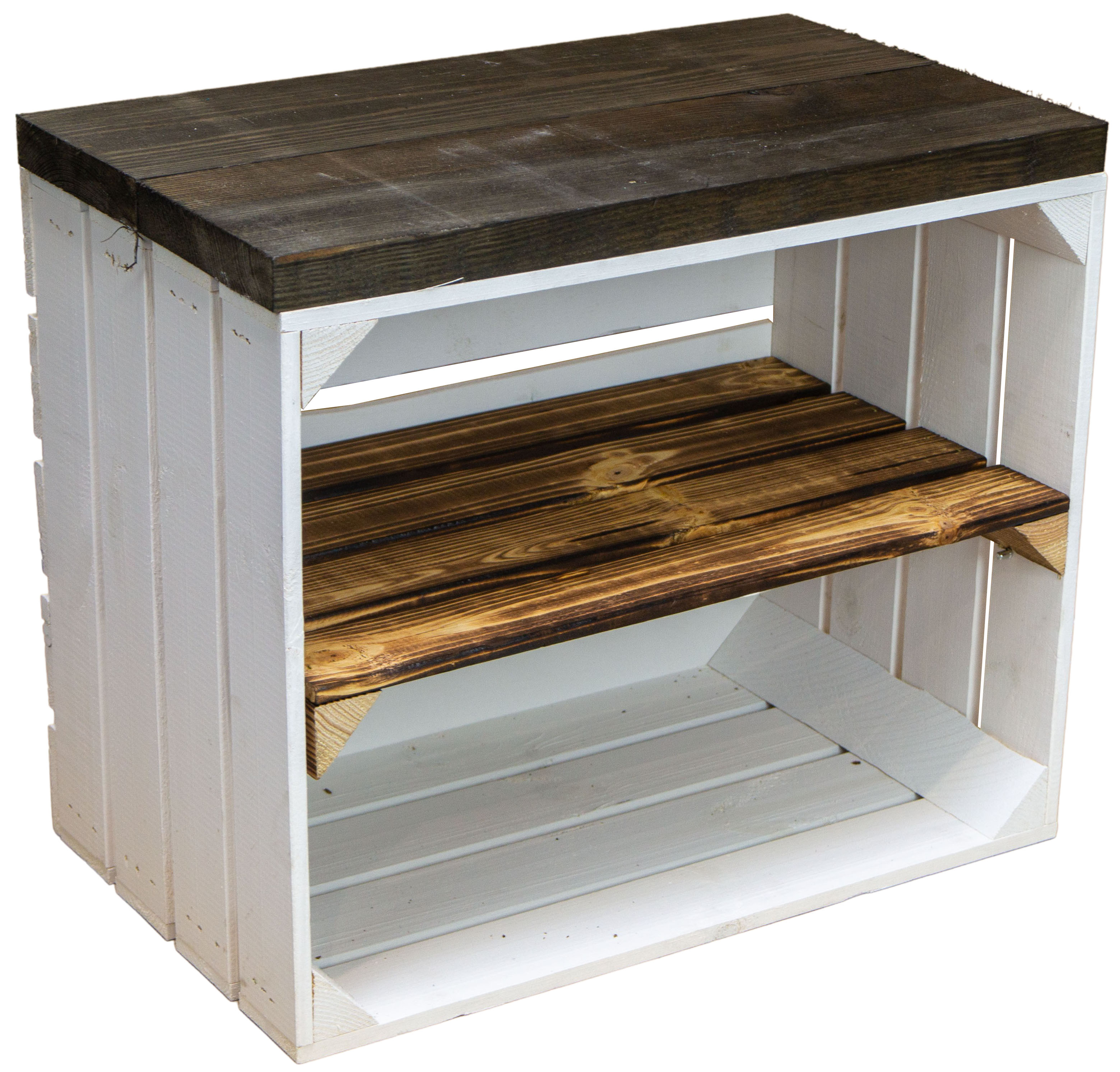 Neue weiße Obstkiste mit Mittelbrett "LÄNGS" mit massiver Holzplanke
