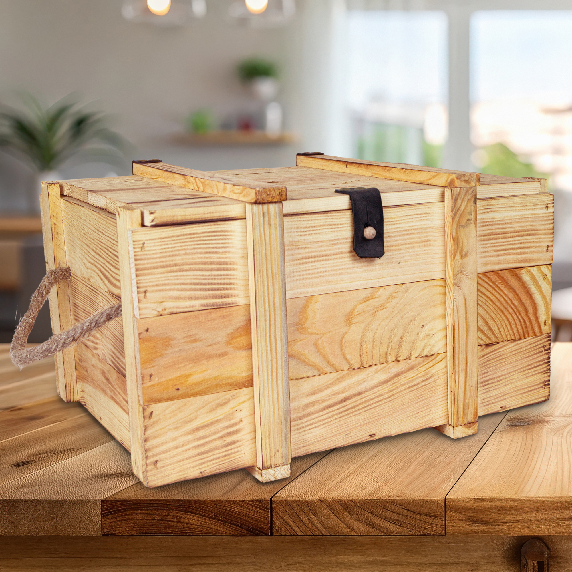 Neu und handgefertigte Weinkisten die nach Ihrer Anfertigung liebevoll beflammt wurden. Diese gibt der Kiste einen komplett individuellen touch, bei der die Maserung des Holzes sehr schön zur Geltung kommt. Scharniere & Schließer sind aus Leder!