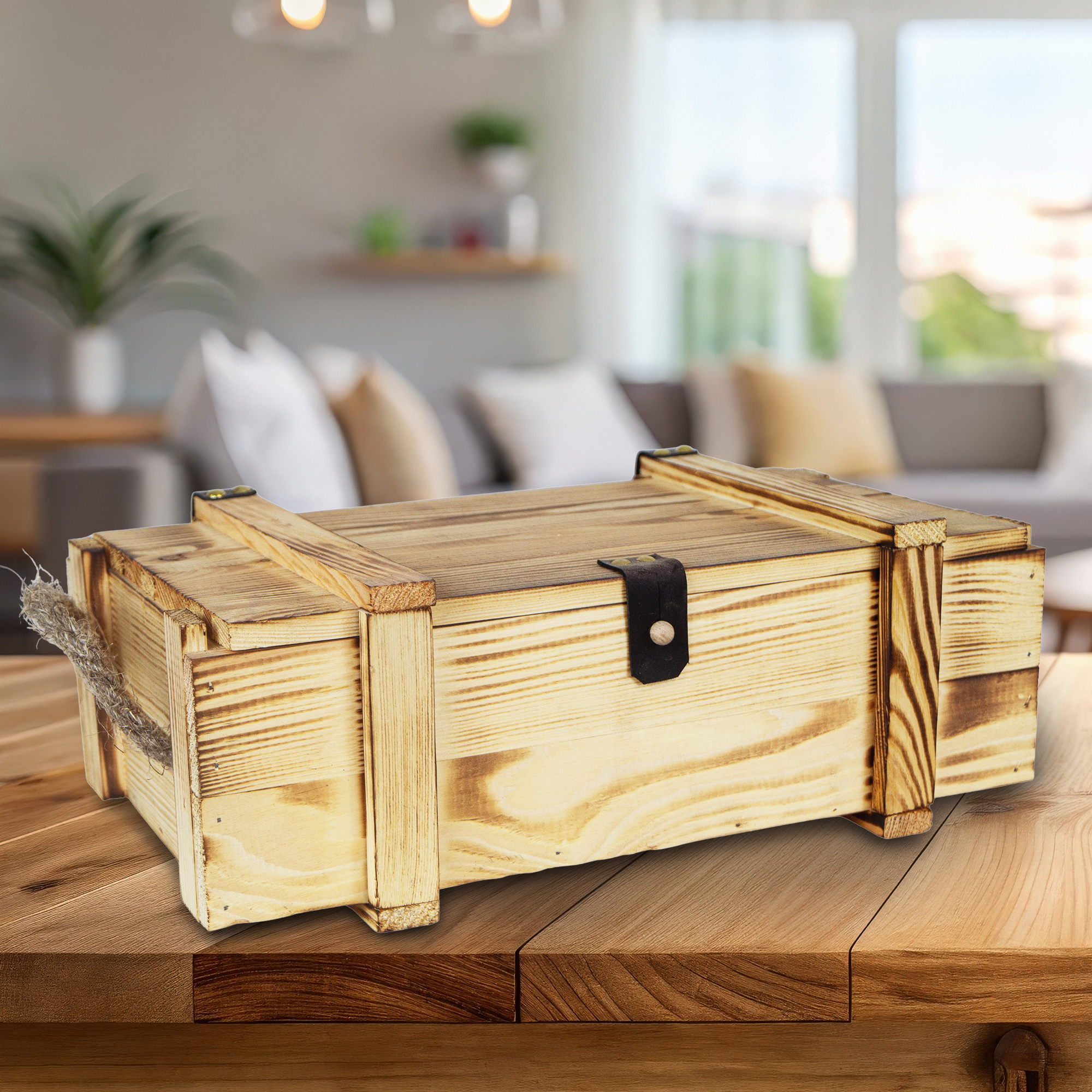 Neu und handgefertigte Weinkisten die nach Ihrer Anfertigung liebevoll beflammt wurden. Diese gibt der Kiste einen komplett individuellen touch, bei der die Maserung des Holzes sehr schön zur Geltung kommt. Scharniere & Schließer sind aus Leder!
